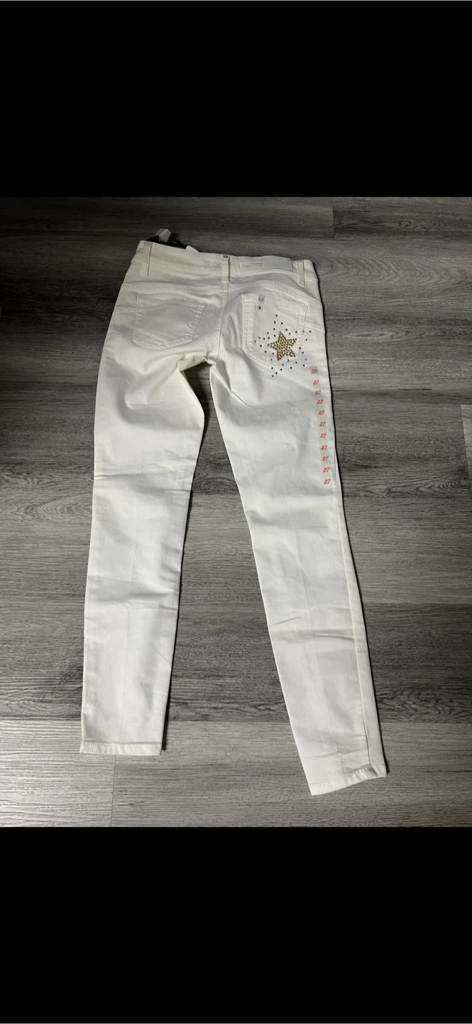 These Liu Jo Jeans are a size 27 and are white with star embellishments. They're made of denim. These jeans are a stylish addition for any wardrobe!