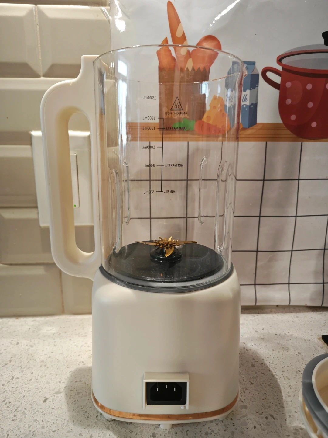 This Ziknost 8-in-1 blender makes nut milk, soy milk, and more. It features automatic soybean machine functions with delay start and keep warm options. The glass pitcher has clear measurement markings up to 1300mL for cold liquids and 1000mL for hot liquids.