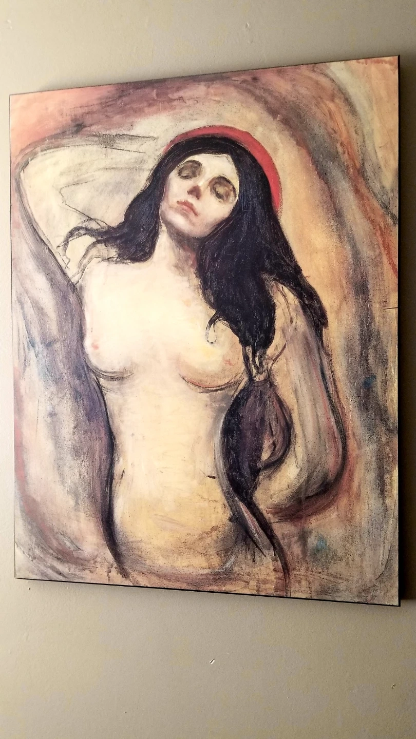 This is a painting of a nude woman. The artwork features a woman with dark hair and closed eyes against a swirling, abstract background. It's an expressive piece, possibly a portrait or study.