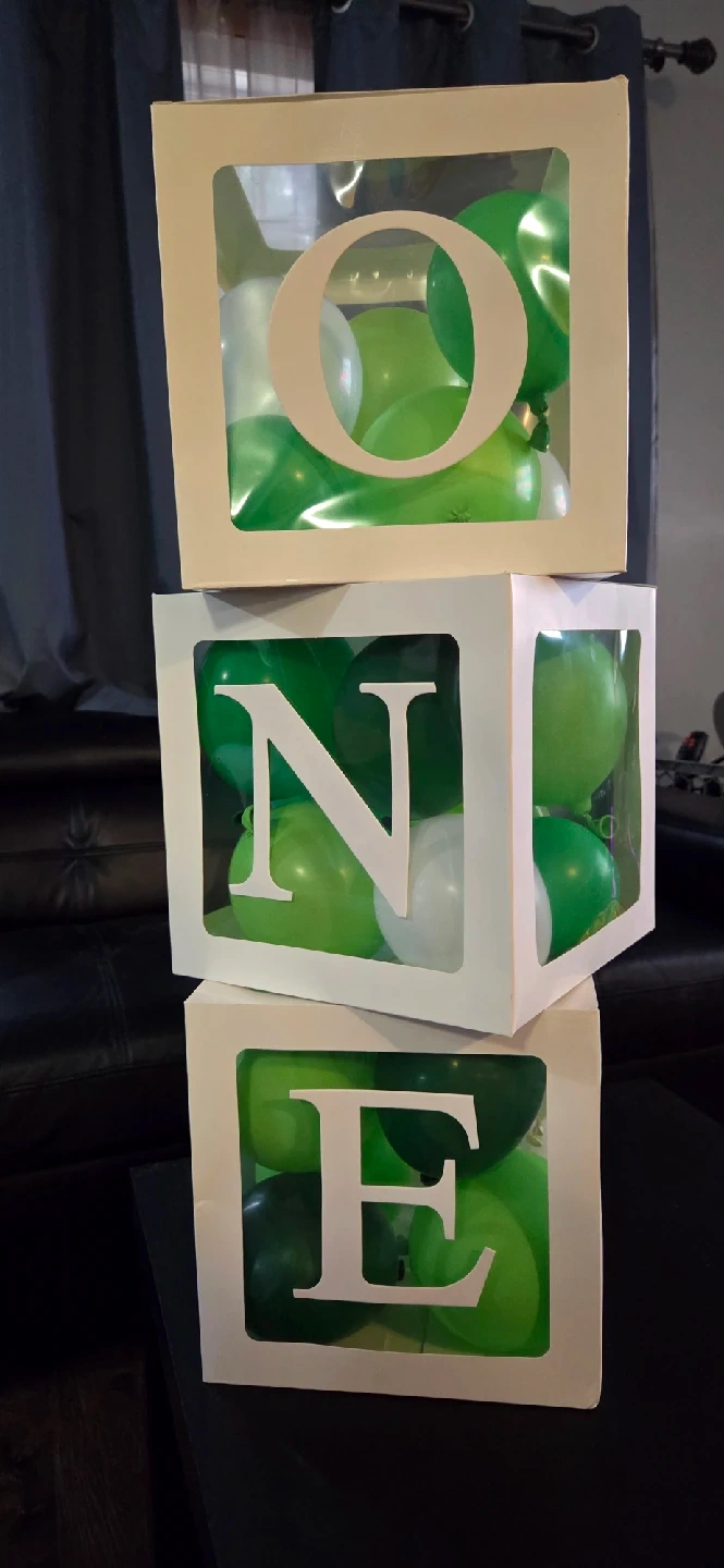 10These cute balloon boxes spell out "ONE" and are perfect for decorating a baby's first birthday party or photoshoot! They're in great condition and ready to add a special touch to your celebration. come with balloons (greens and white).