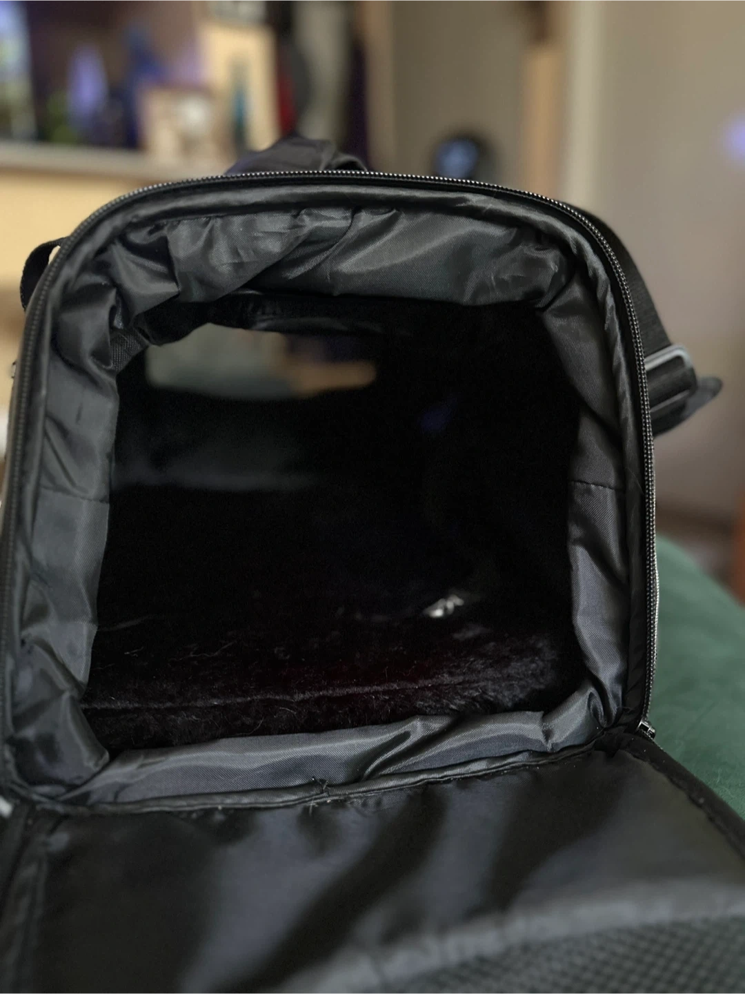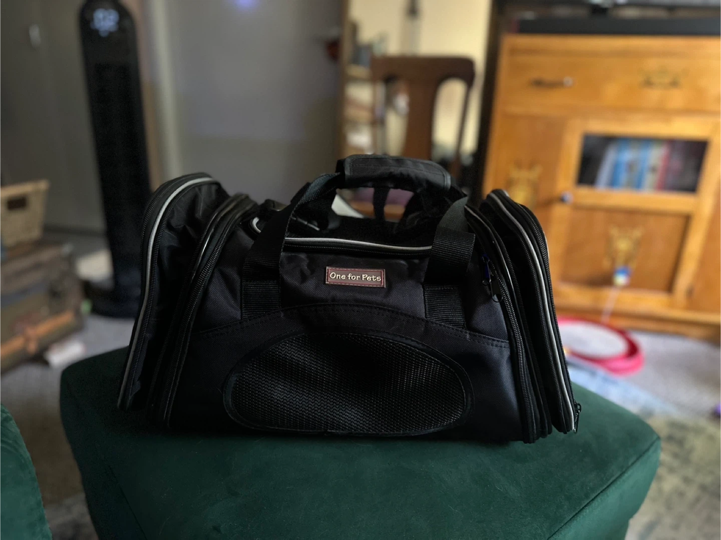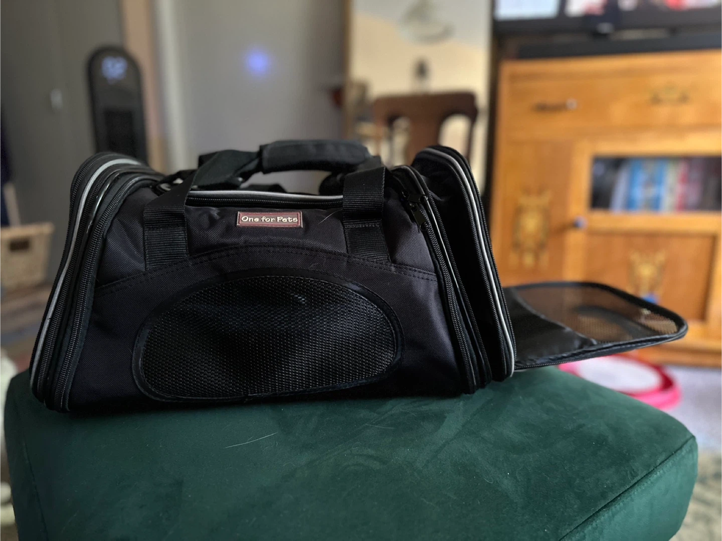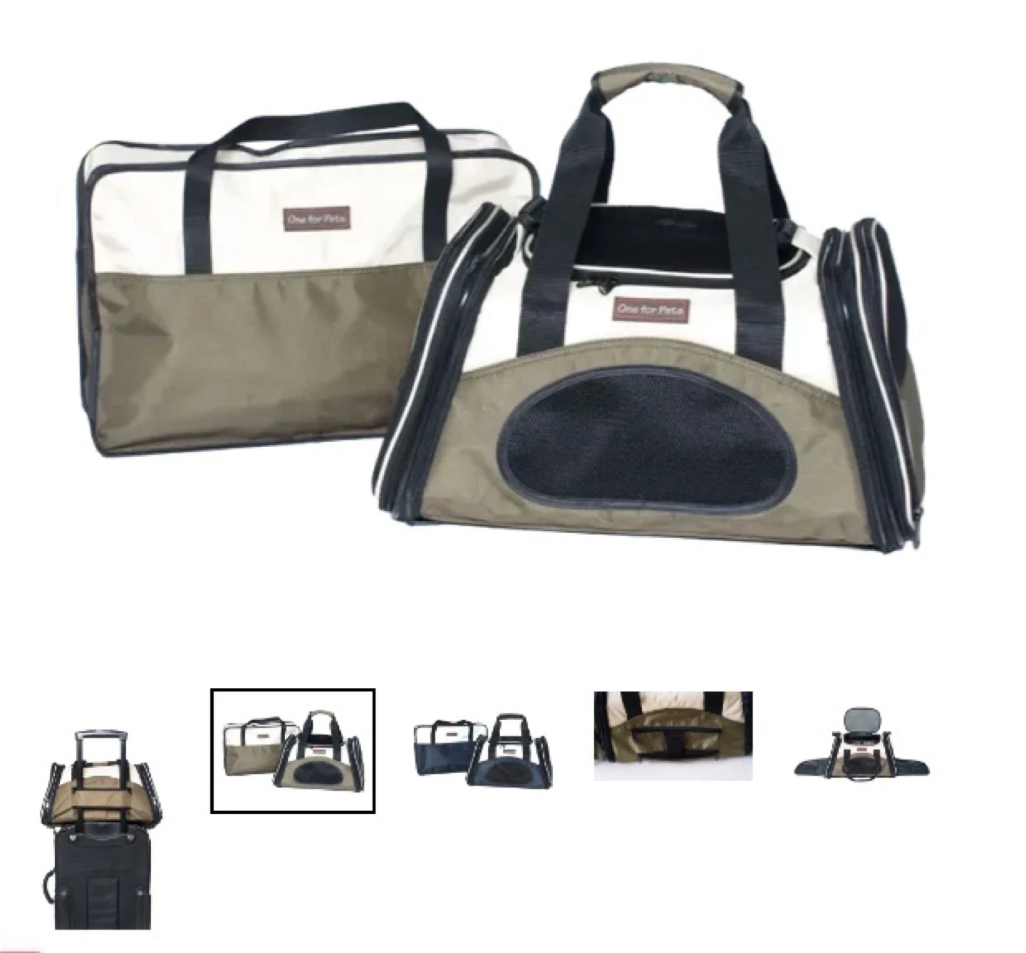 Used only a couple times, airline approved. It’s good for a pet of up to 10 pounds. It is somewhat expandable and can be fitted over a suitcase handle.