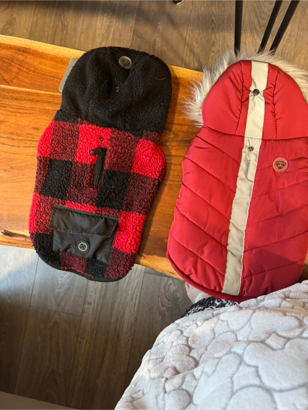 10Two adorable dog coats for sale! One is a classic red and black plaid, and the other is a stylish red puffer style with a faux fur trim. Both are size large, perfect for keeping your furry friend warm and cozy during those chilly Canadian walks. They're in great condition and ready for a new home!