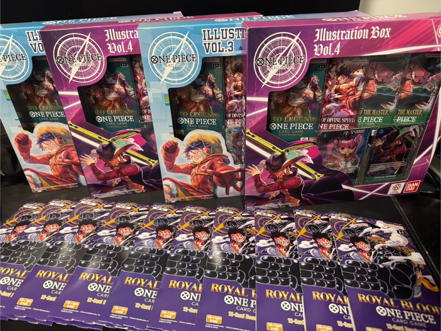 Selling One Piece Card Game Illustration Boxes Vol. 3 and Vol. 4, plus a bunch of Royal Blood booster packs! Great for any One Piece fan looking to expand their collection Illuatration Box: 50$ each Blister Pack: 12$ eqch