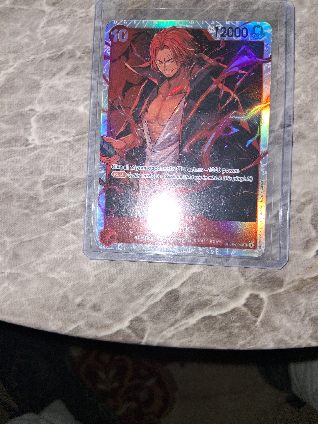 Selling a One Piece Trading Card Game card featuring Shanks! It has a power of 12000. Give all of your opponent's Characters -1000 power. This card can attack on the turn in which it is played