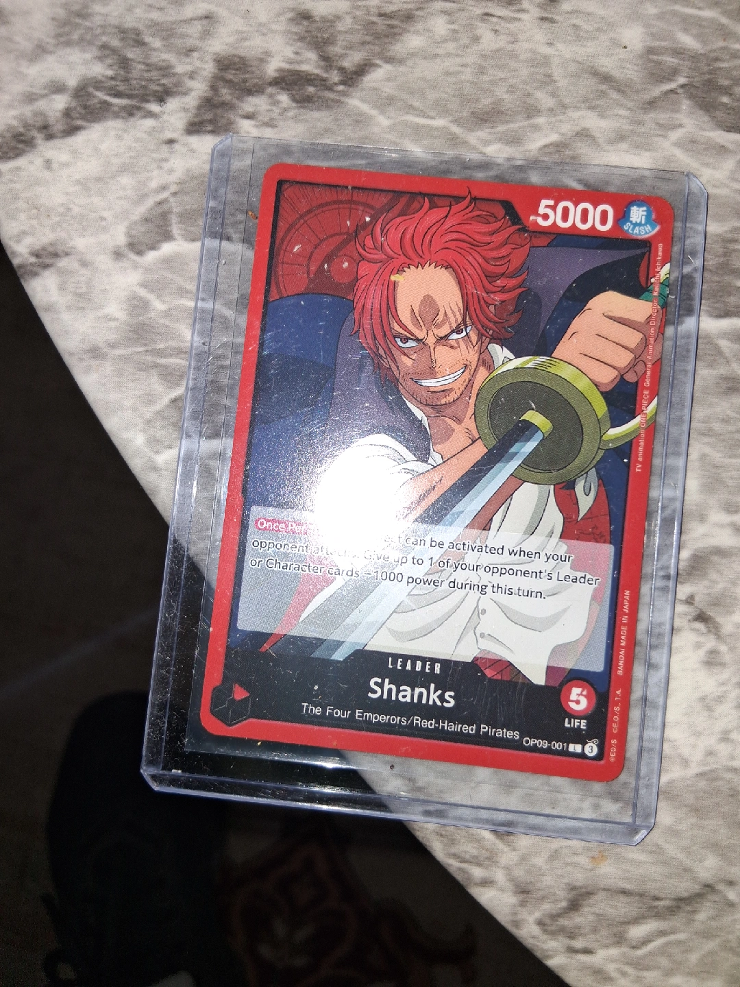 Selling a One Piece Trading Card Game (TCG) card featuring the character Shanks, a Leader card from the Four Emperors/Red-Haired Pirates set (OP09-001). It has a power of 5000 and 5 Life points. This card is in great shape and ready for a new owner!