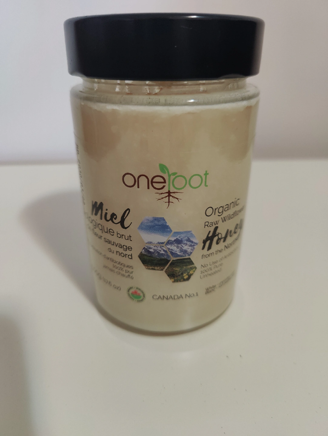 Selling a jar of One Root organic raw wildflower honey from the north. It's a 500g jar of Canada No. 1 honey. The best before date is 2030 March 22