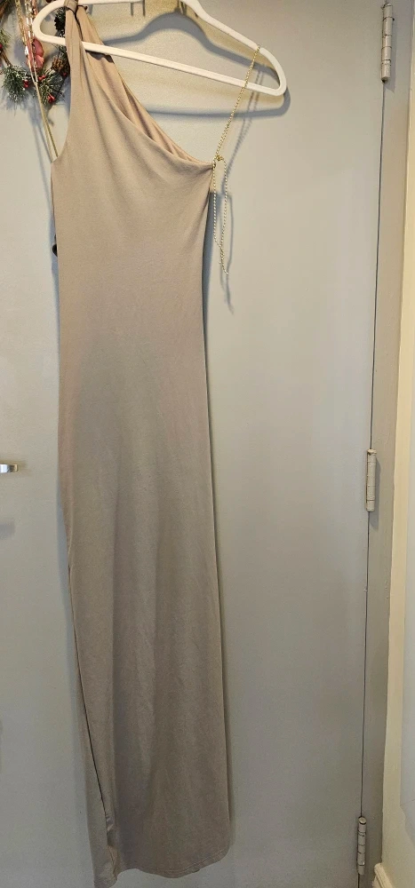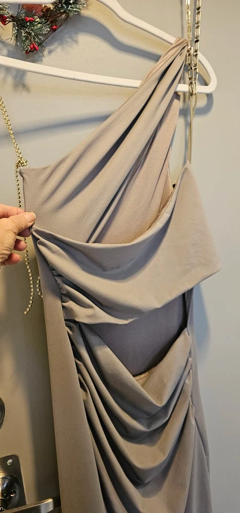 1000+Selling a stylish one-shoulder maxi dress in a neutral colour. It features a unique design with a draped shoulder. Perfect for a special occasion or a night out! the gold straps just for adjust the dress to stand for taking photo. they are not include the dress