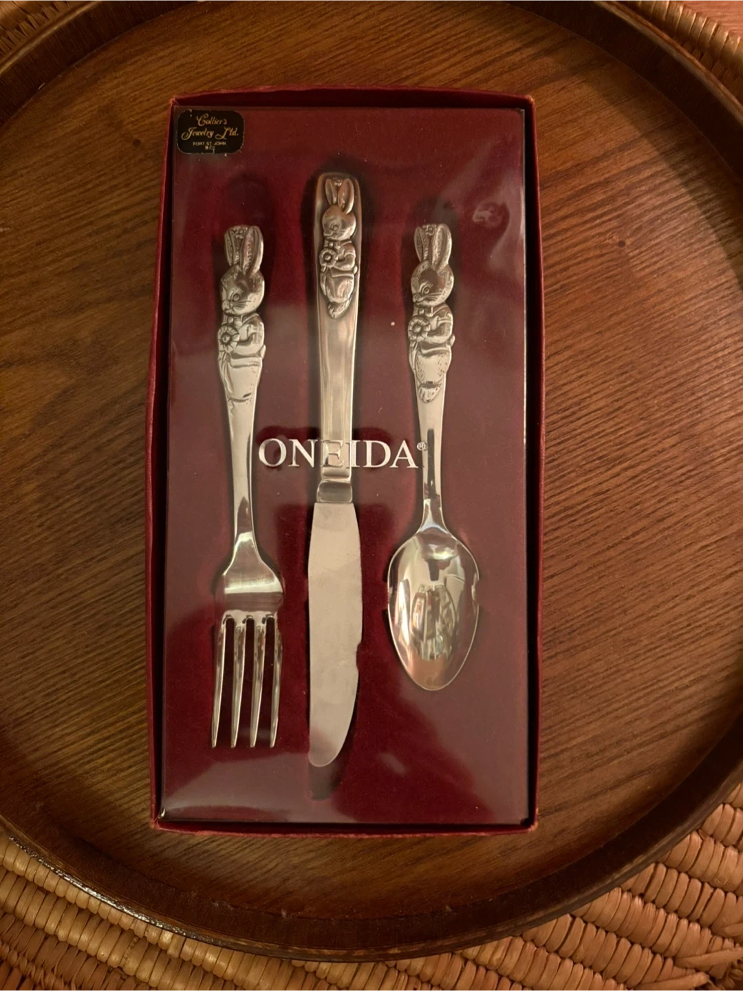 Selling a brand new Oneida children’s size stainless steel set featuring a cute bunny design! This set includes a fork, knife, and spoon, all neatly packaged in the original box. Perfect for adding a touch of whimsy to your table! Knife 7” Spoon 5” Fork 5”