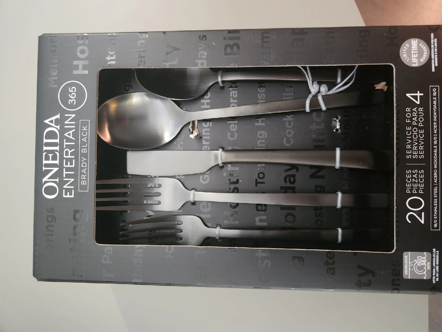 Looking to add a touch of modern elegance to your dining table? This Oneida Entertain 365 Brady Black flatware set is just the ticket! Brand new in box, this 20-piece set includes service for 4. It's crafted from 18/0 stainless steel and is dishwasher safe for easy cleanup