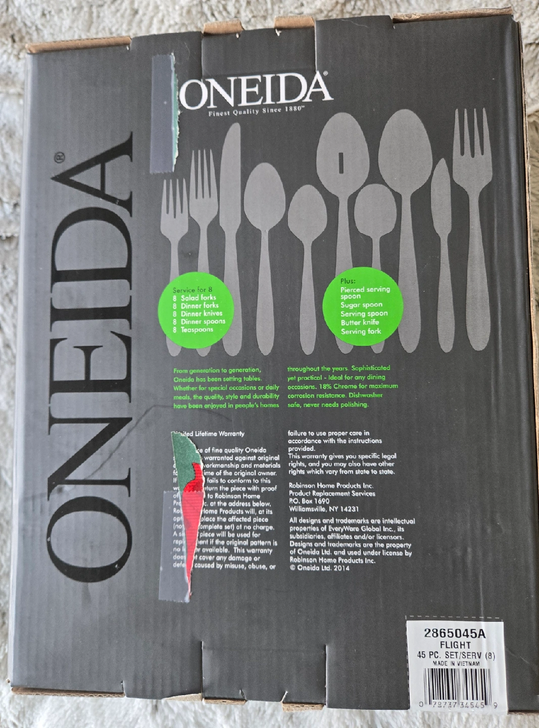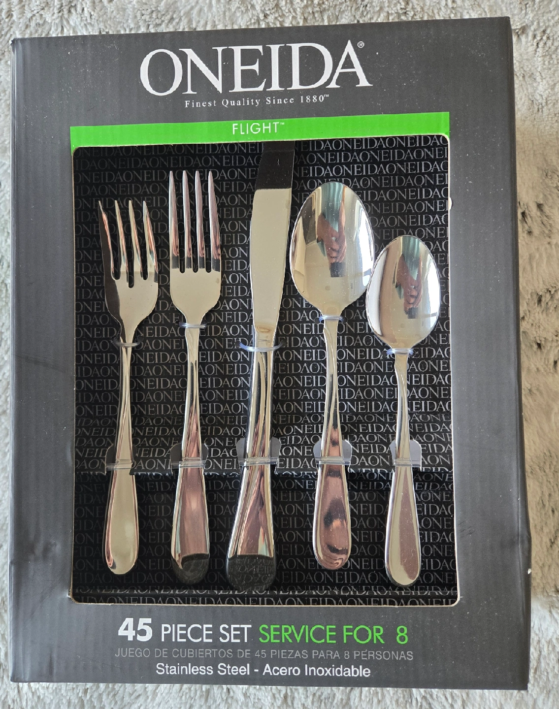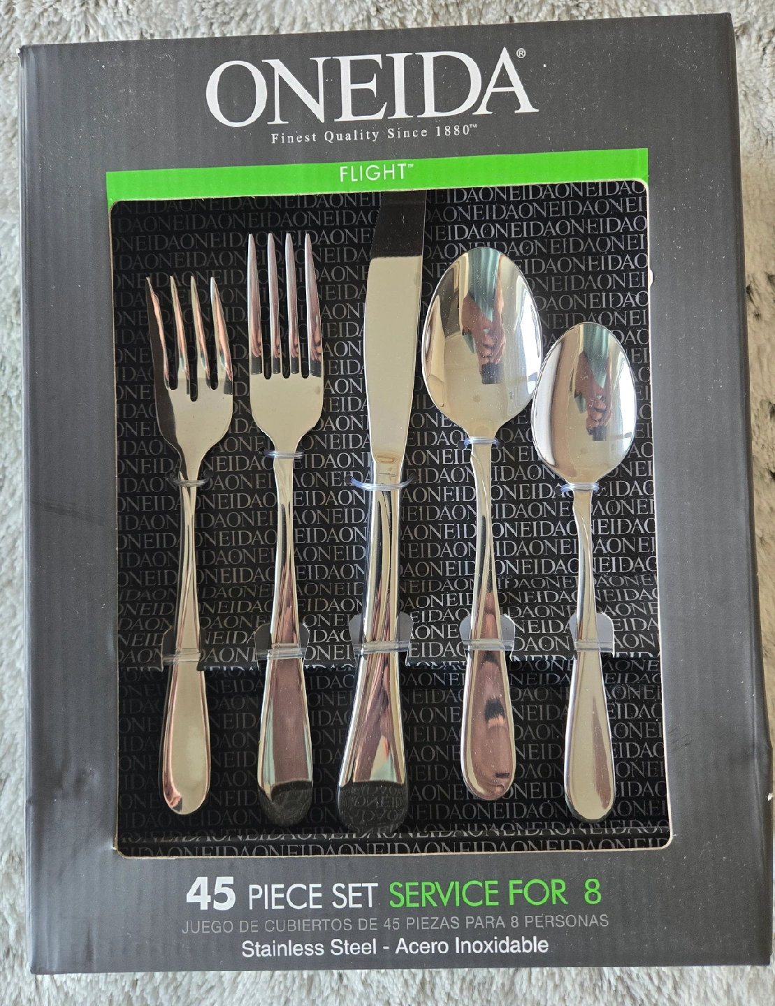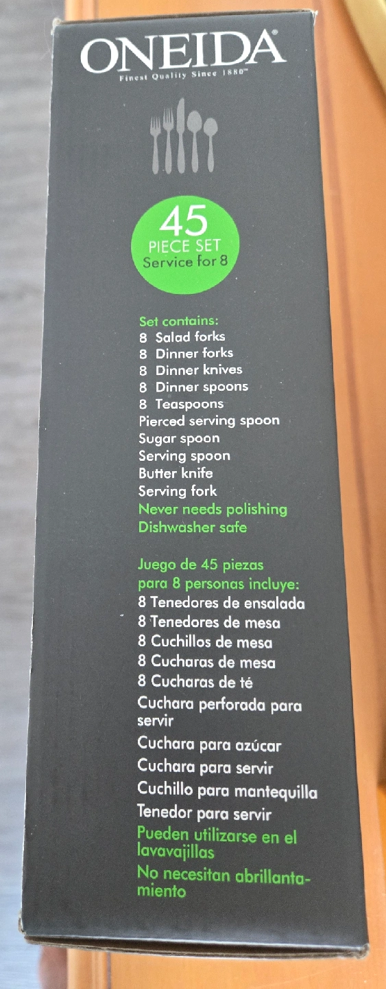Selling a brand new Oneida Flight 45-piece flatware set, service for 8. This set includes: - 8 salad forks - 8 dinner forks - 8 dinner knives - 8 dinner spoons - 8 teaspoons - Pierced serving spoon - Sugar spoon - Butter knife - Serving fork This stainless steel set is dishwasher safe and never needs polishing! Comes in the original box.Paid $103 plus tax for them.