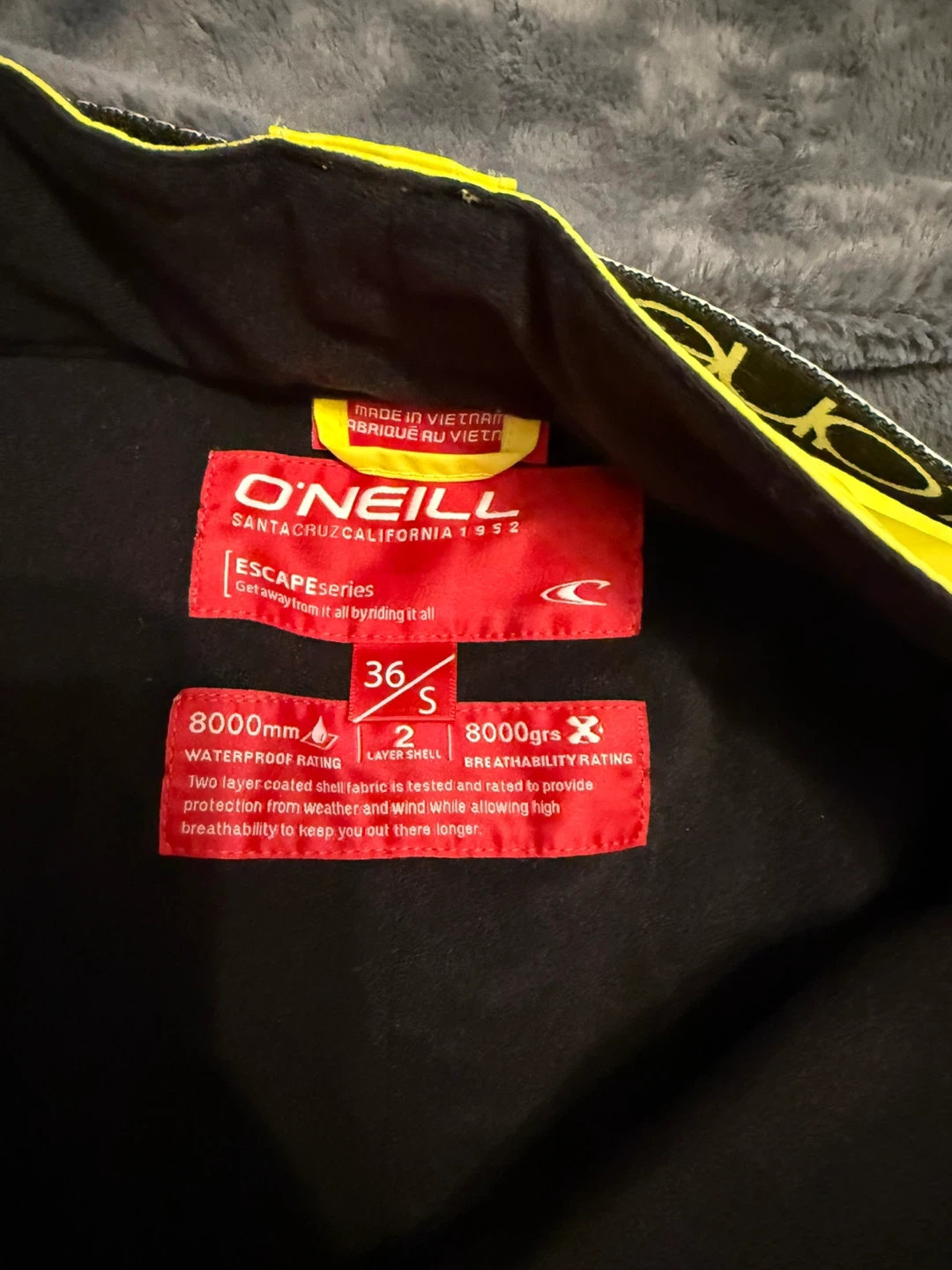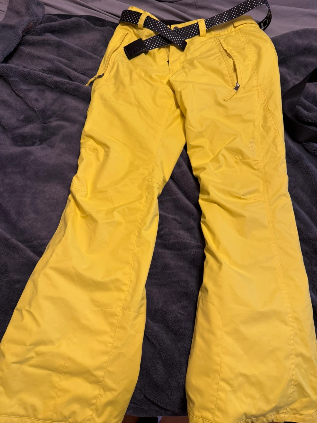 Selling a pair of O'Neill Escape Series snow pants in a vibrant yellow colour! They are a size small (S) and feature a stylish black and white polka dot belt. Key features include: - Waterproof rating of 8000mm - Breathability rating of 8000grs - Two-layer coated shell fabric for protection from weather and wind