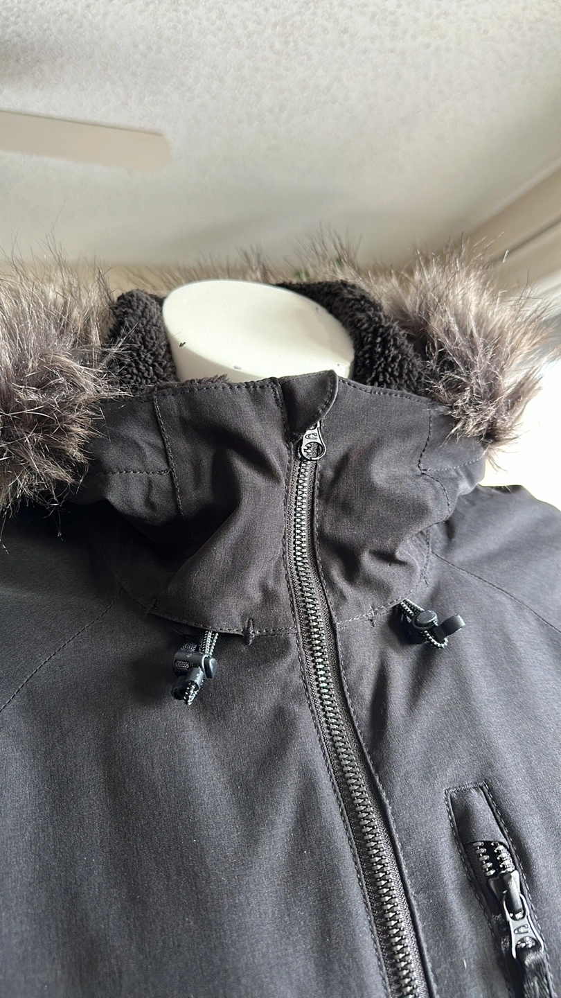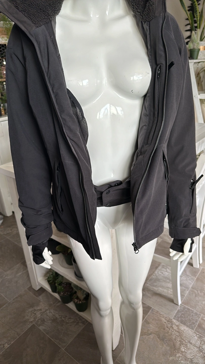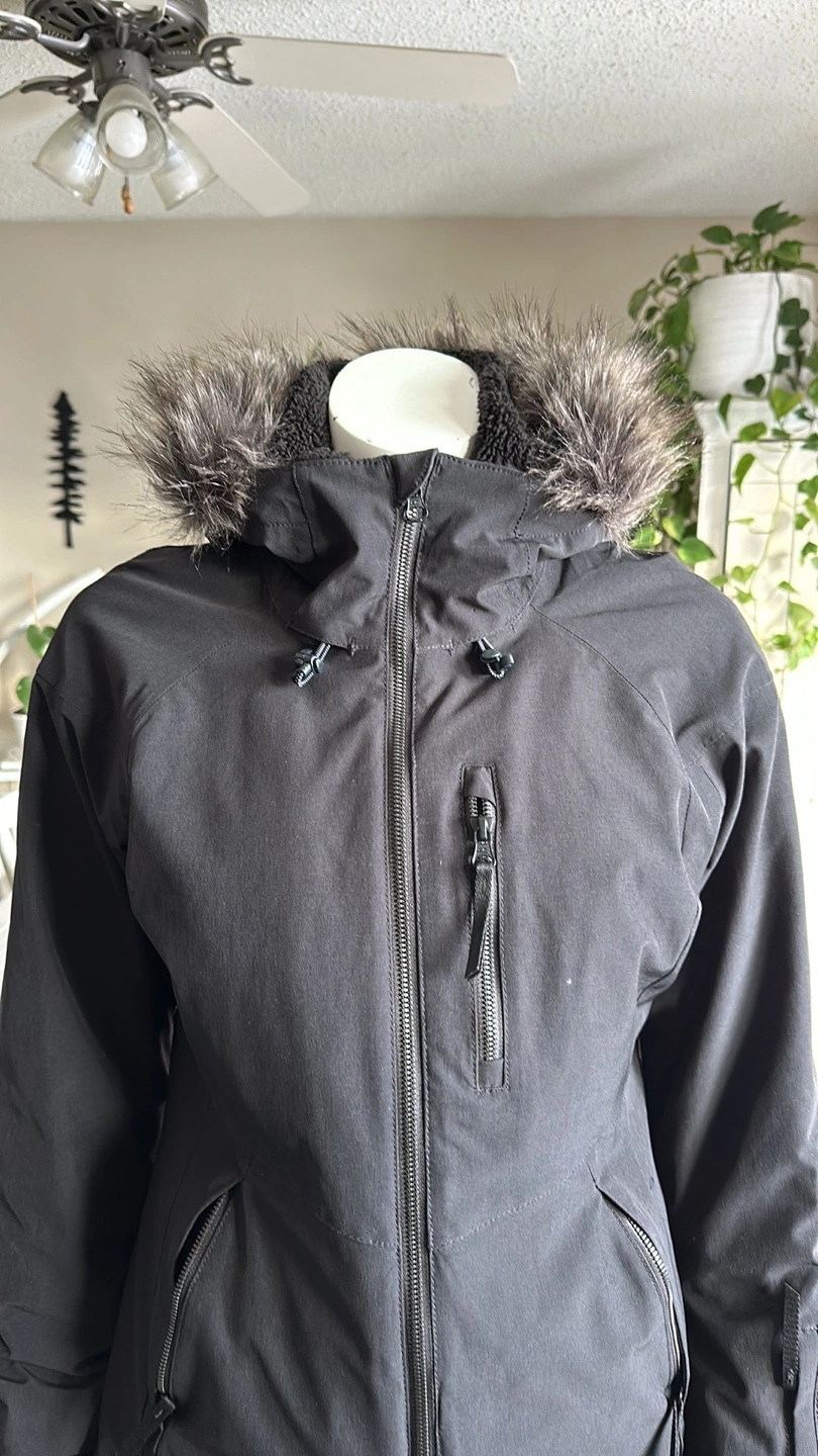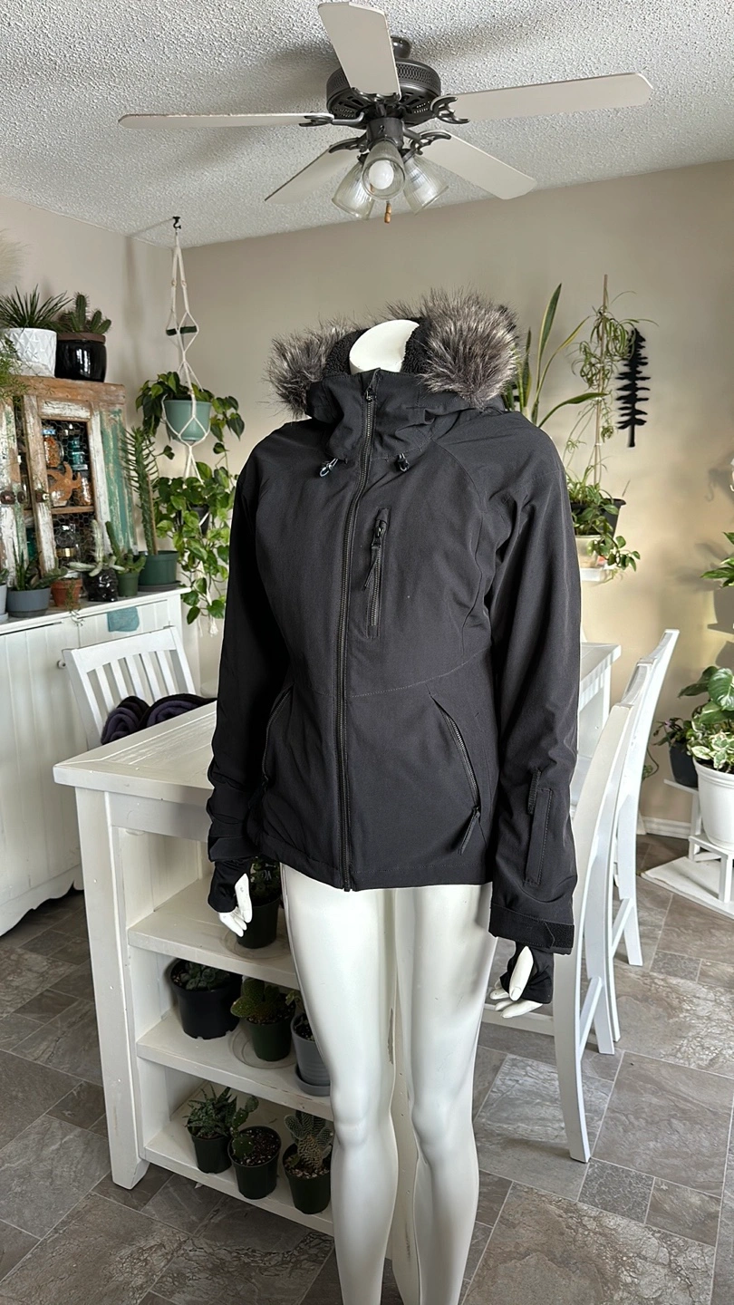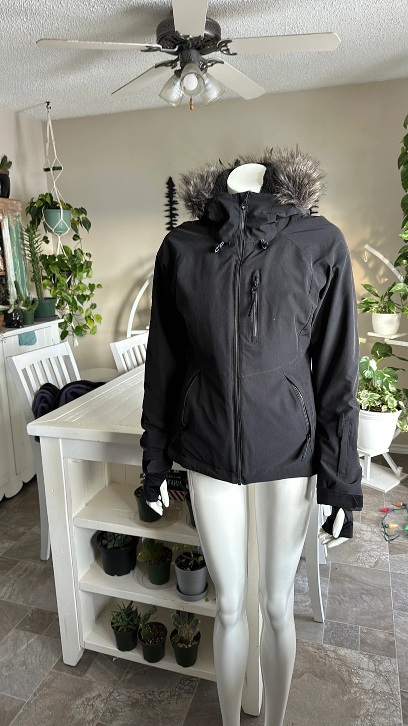 10Black ski jacket with a faux fur-lined hood. Size medium. Brand new Vauxite O’Neill black winter sporting or every day jacket Jacket is brand new without tags, zip pockets in front and one in chest area, and also another in the arm pull tie hood with Sherpa lined neck mesh inside with inside pocket and waist tightener Fleece lined back and sides and tightening for waist and bottom of him 92% polyester 8% lasting knitted lining is 100% polyester woven lining 100% poly is 100% polyester