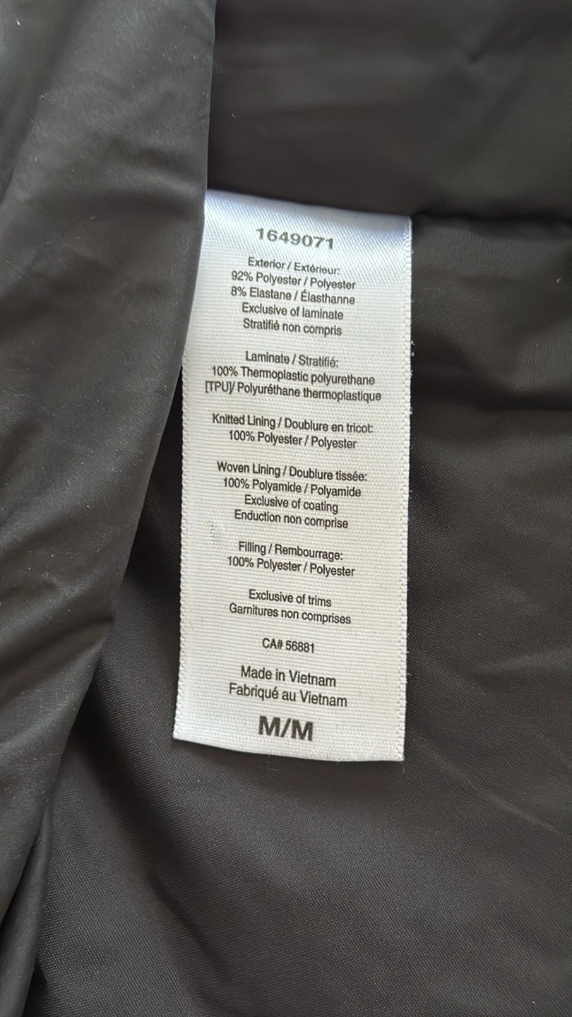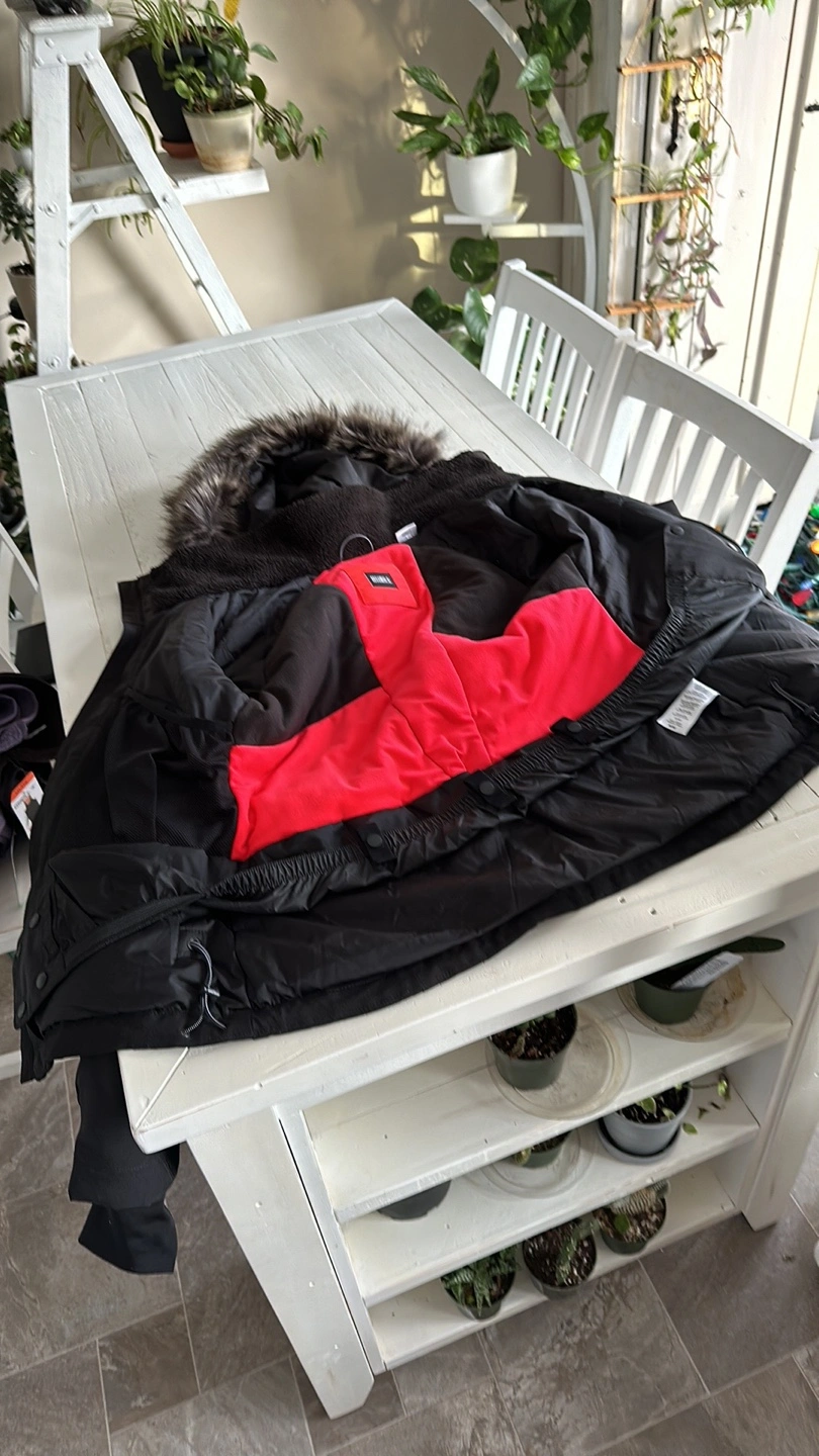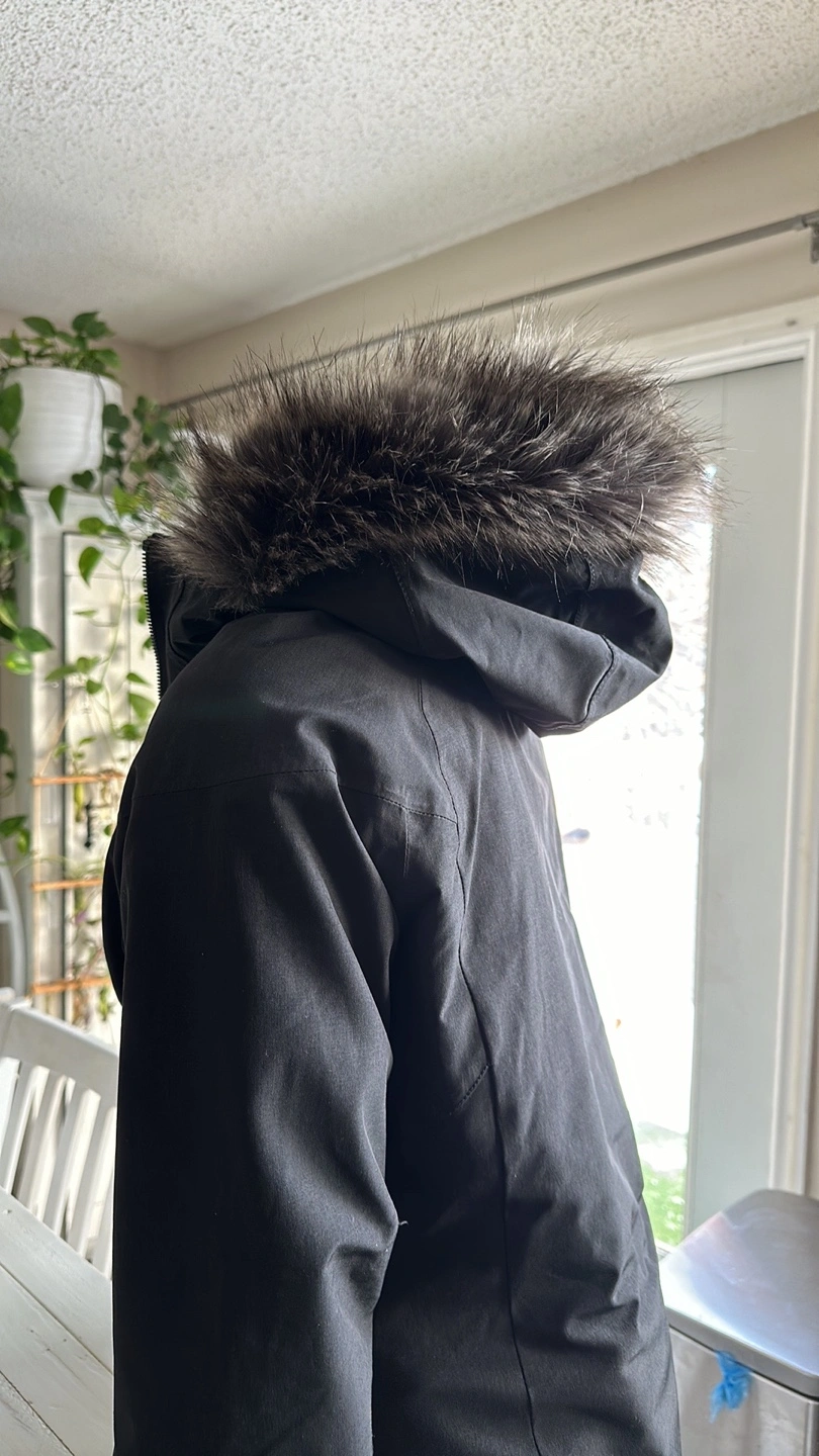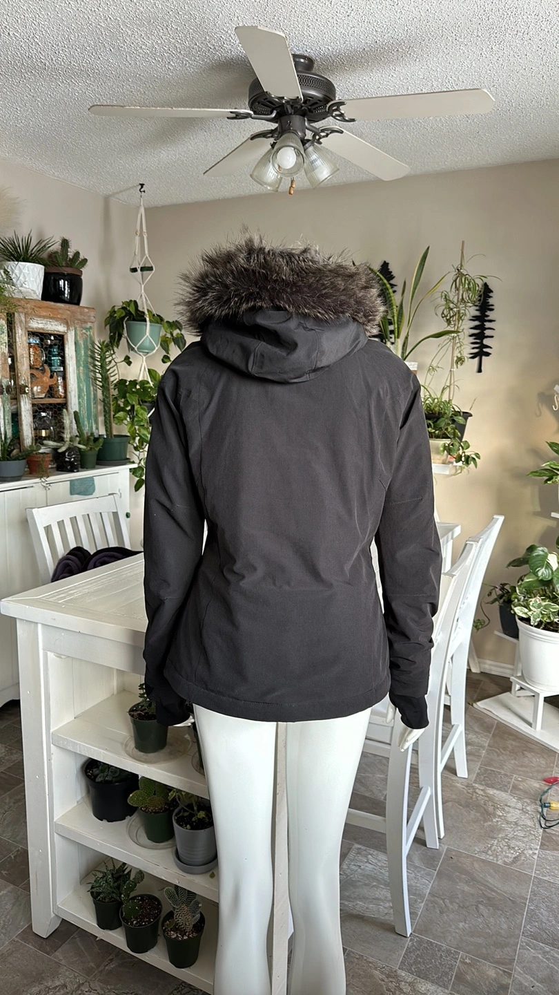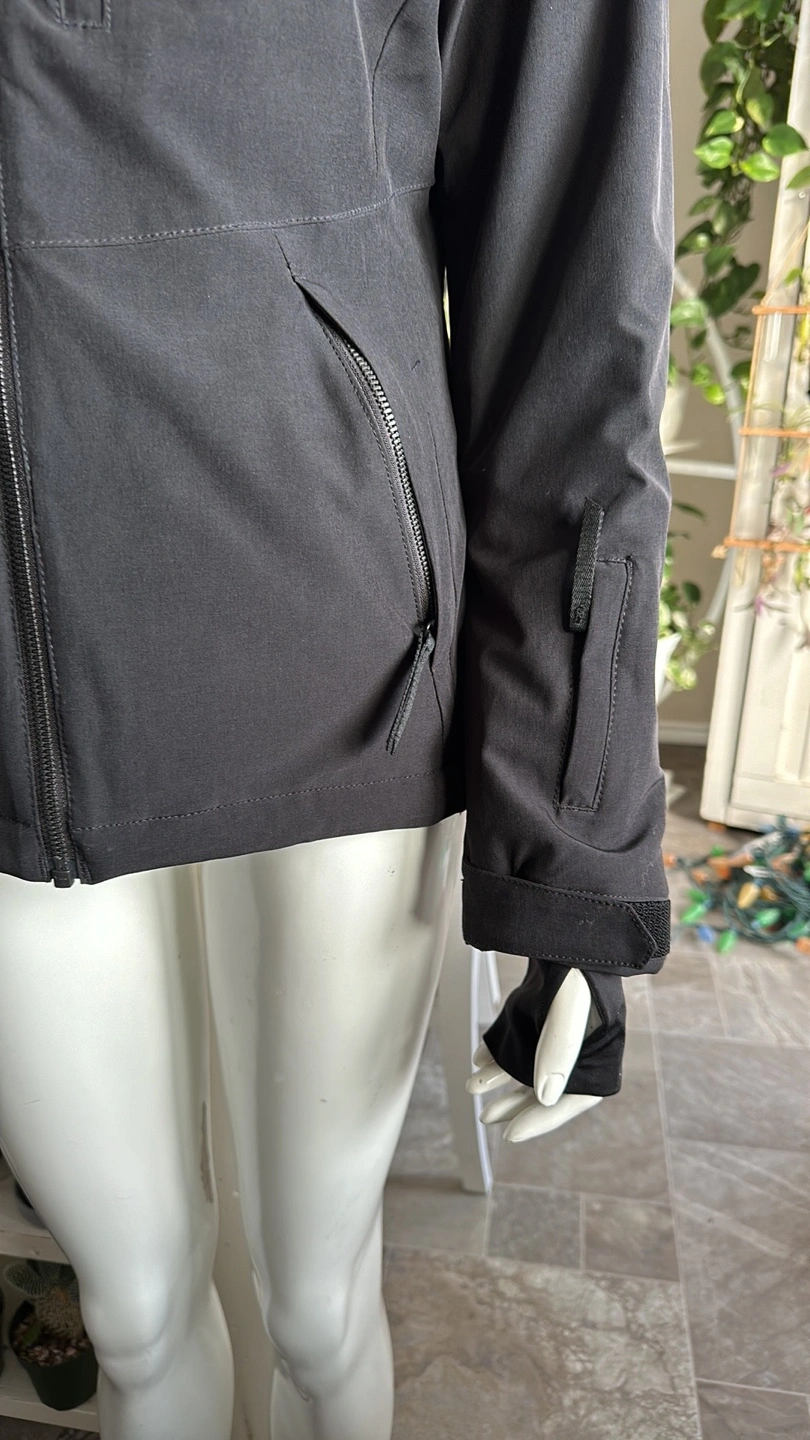 10Black ski jacket with a faux fur-lined hood. Size medium. Brand new Vauxite O’Neill black winter sporting or every day jacket Jacket is brand new without tags, zip pockets in front and one in chest area, and also another in the arm pull tie hood with Sherpa lined neck mesh inside with inside pocket and waist tightener Fleece lined back and sides and tightening for waist and bottom of him 92% polyester 8% lasting knitted lining is 100% polyester woven lining 100% poly is 100% polyester