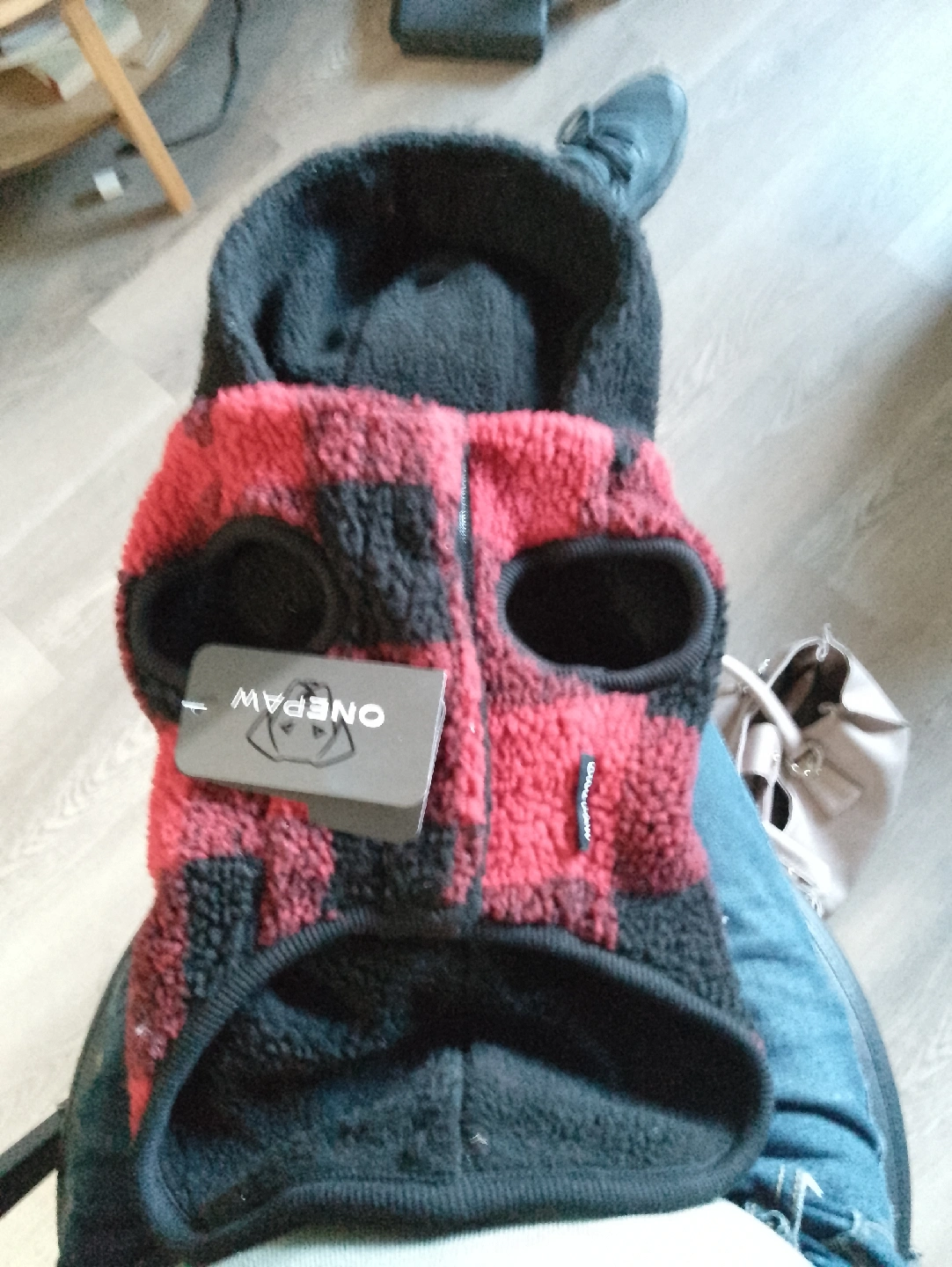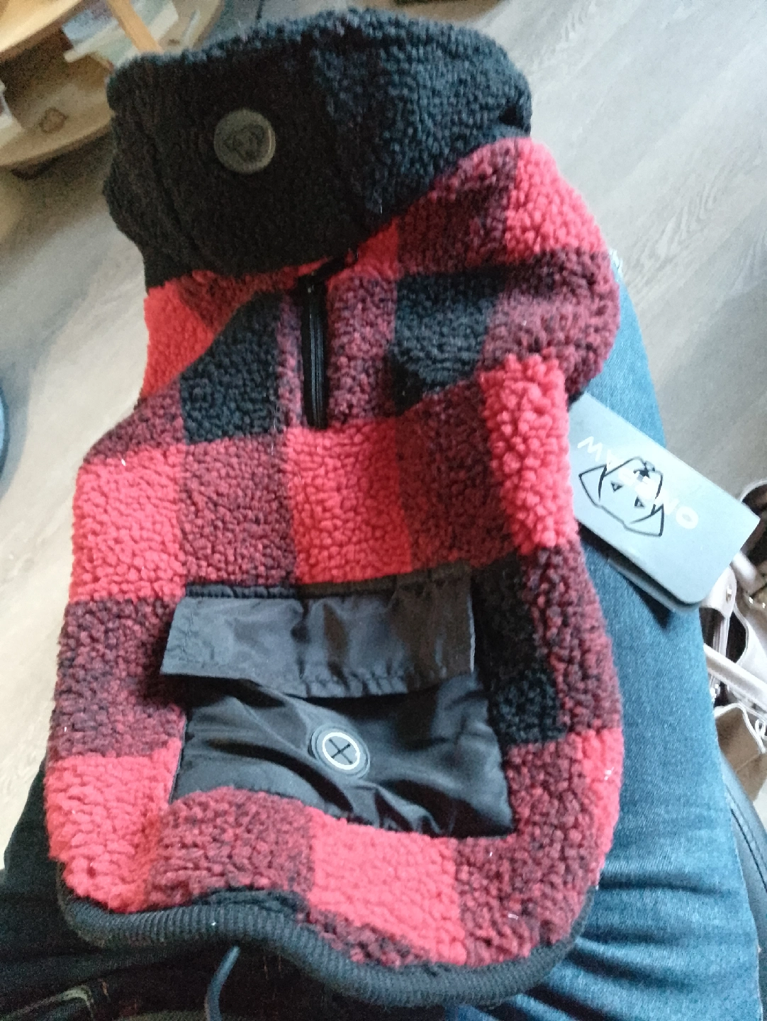 Keep your furry friend warm and stylish with this ONEPAW dog coat! It features a red and black buffalo plaid pattern with a cozy black fleece lining. The coat includes a convenient pocket and a zipper closure for easy on and off. Perfect for those chilly Canadian walks!