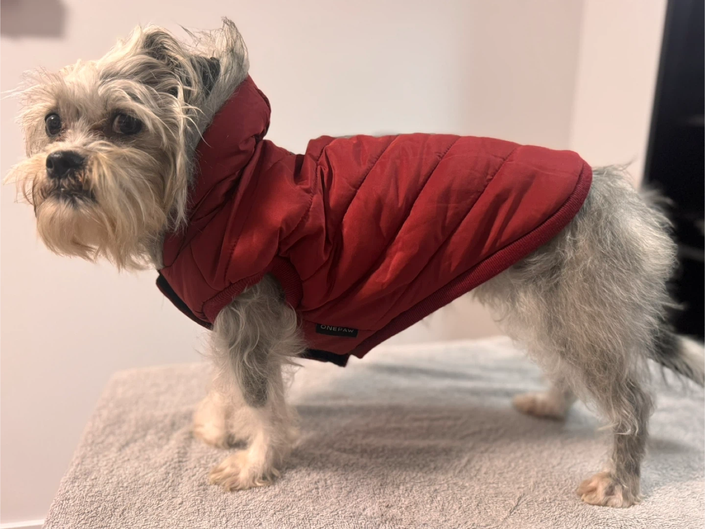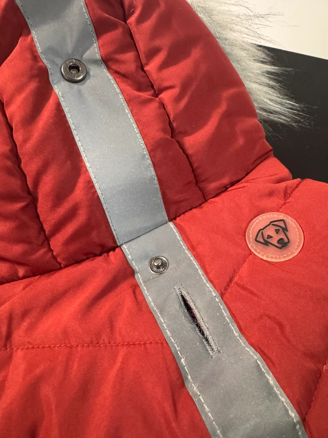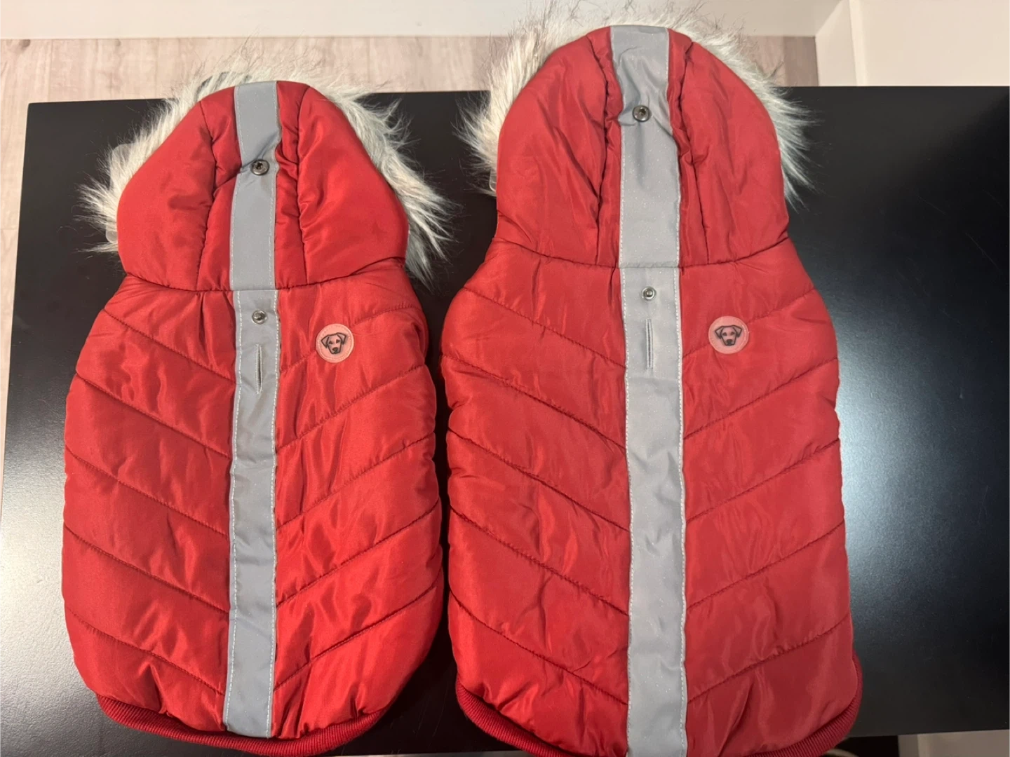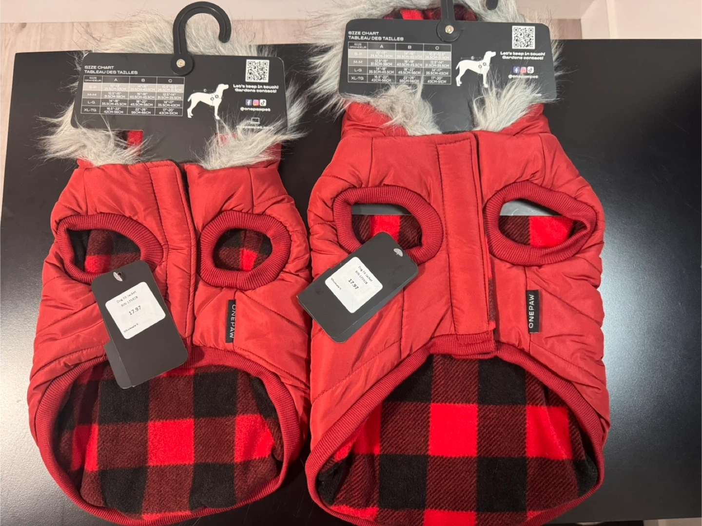 61Keep your furry friend warm and stylish with this ONEPAW dog jacket! It's a vibrant red colour and features a cozy lining, water-resistant fabric, and reflective trims for added safety. Plus, there's an opening for a leash, making walks a breeze. Multiple jackets available sizes S and M. PRICE IS FOR EACH JACKET