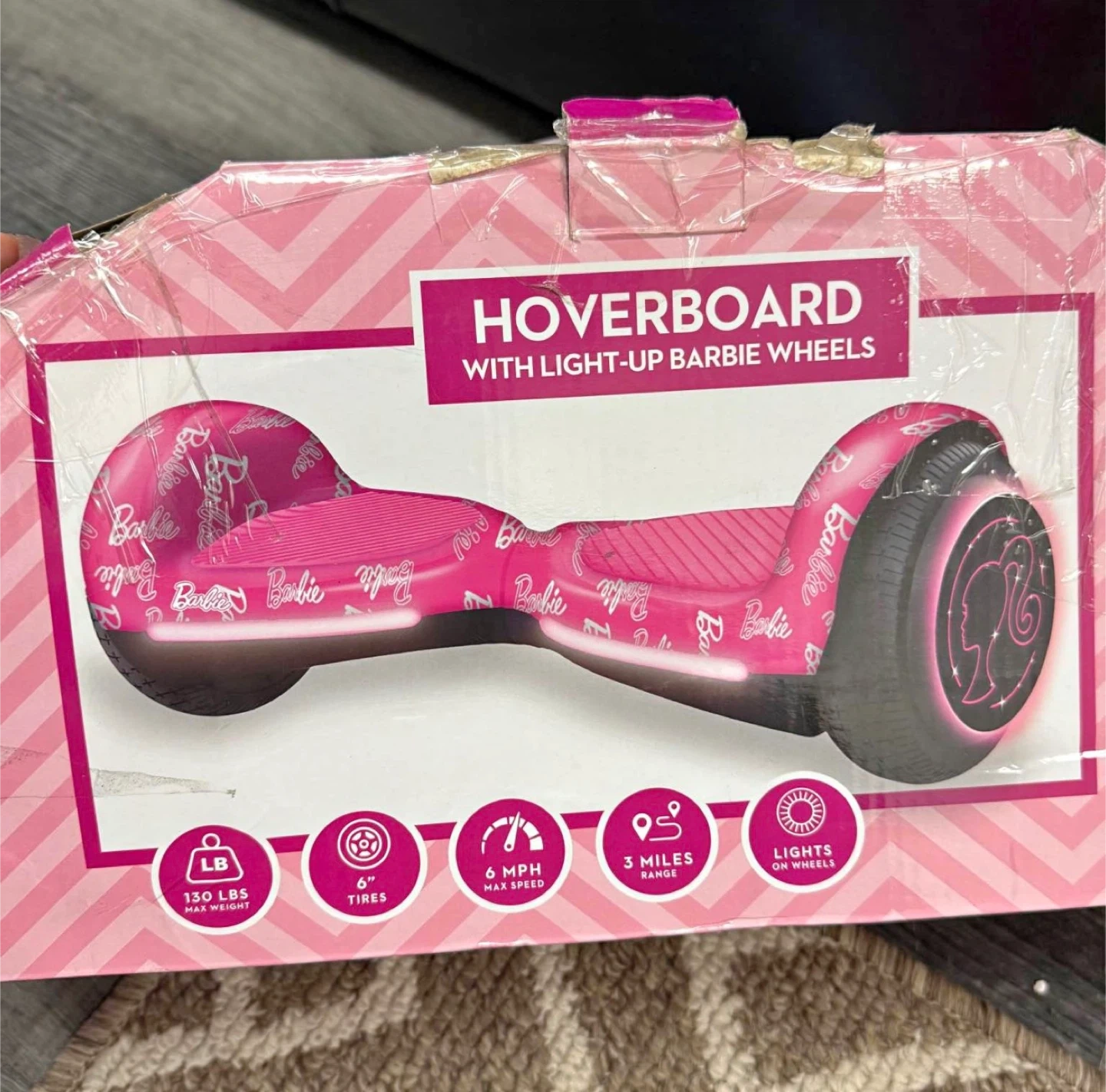 Bright pink Barbie hoverboard with light-up wheels. It supports up to 150 lbs max weight and has 6" tires. Max speed is 6 MPH with a 3 mile range. Fun for rides around the neighbourhood!