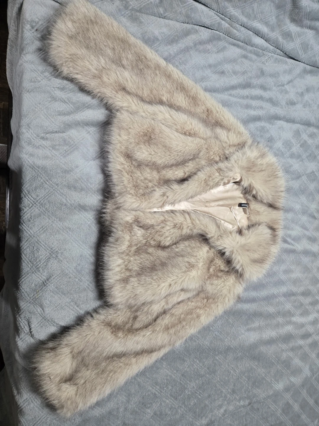 This is a faux fur jacket from DIVIDED by H&M. It's a cropped style with a satin lining. The colour is a light, neutral tone.