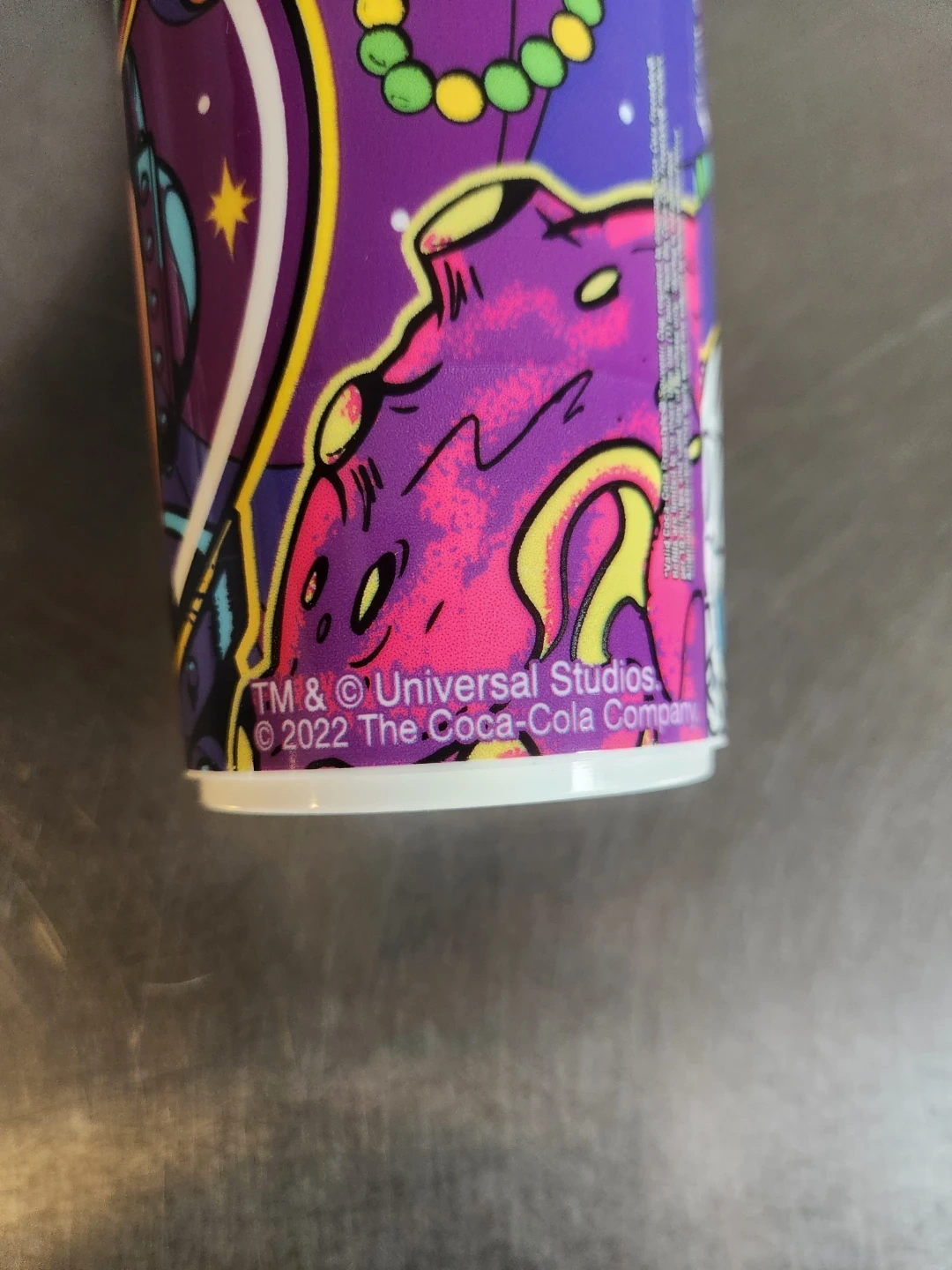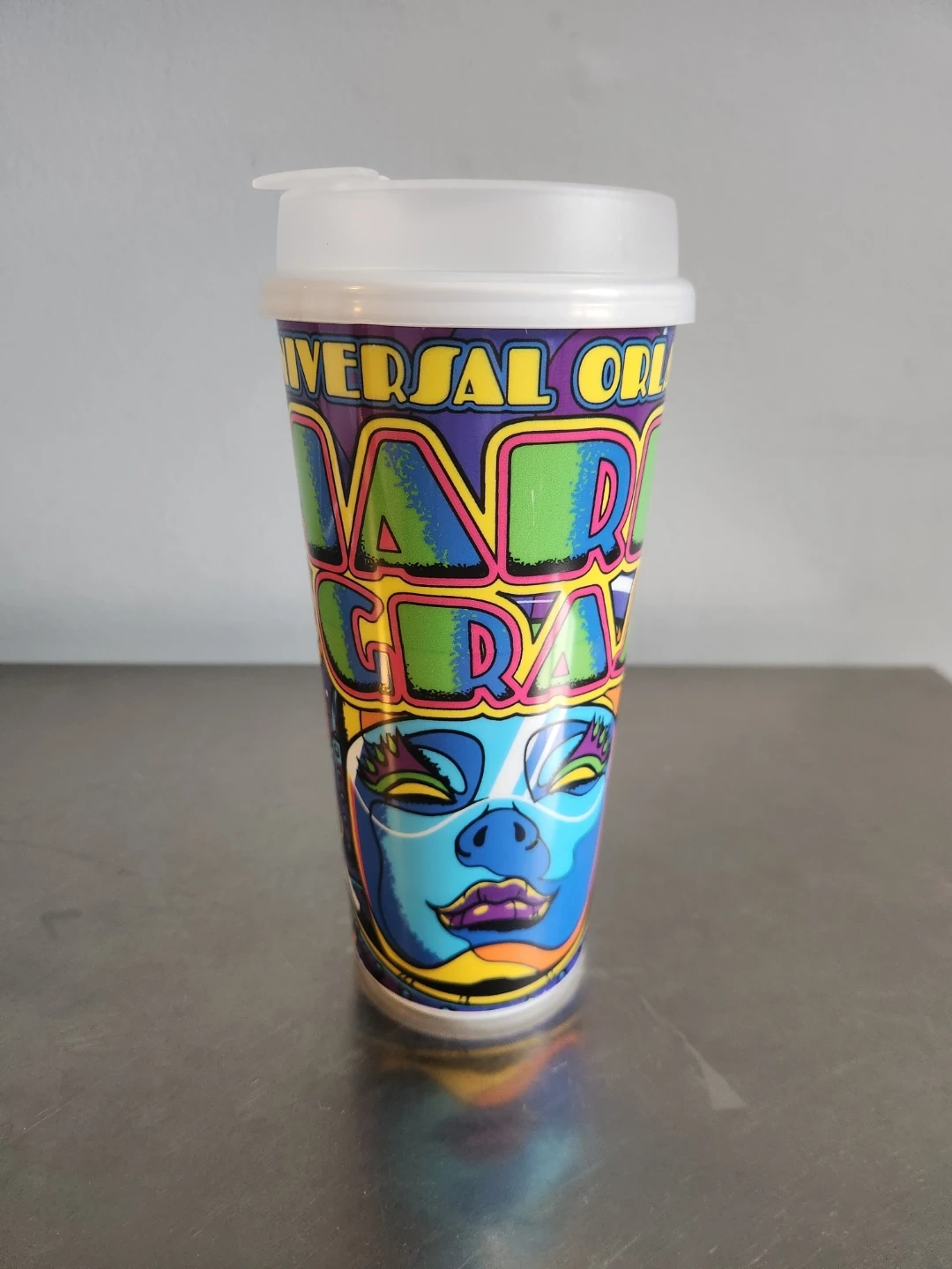 Reusable tumbler featuring a vibrant Mardi Gras design from Universal Studios Orlando. Includes a white plastic lid with a flip-top closure. Copyrighted 2022.