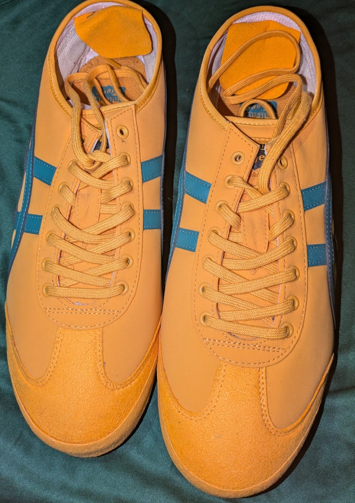 These Onitsuka Tiger sneakers are a vibrant yellow with blue accents! They're in great shape and ready for a new home. Perfect for adding a pop of colour to your outfit