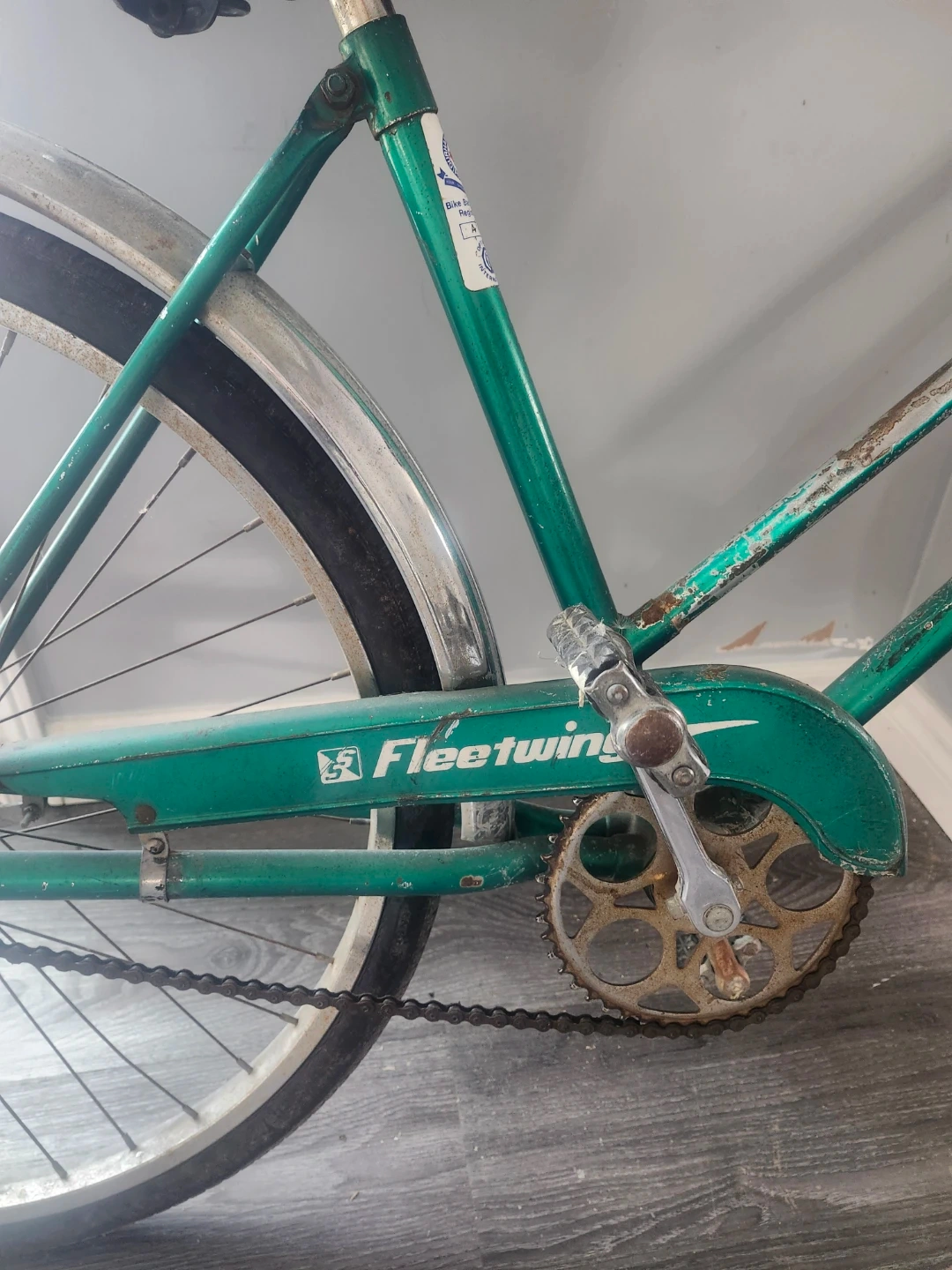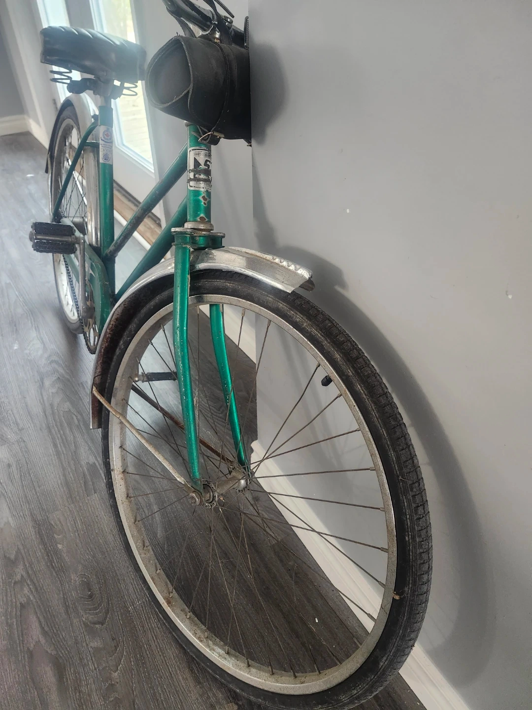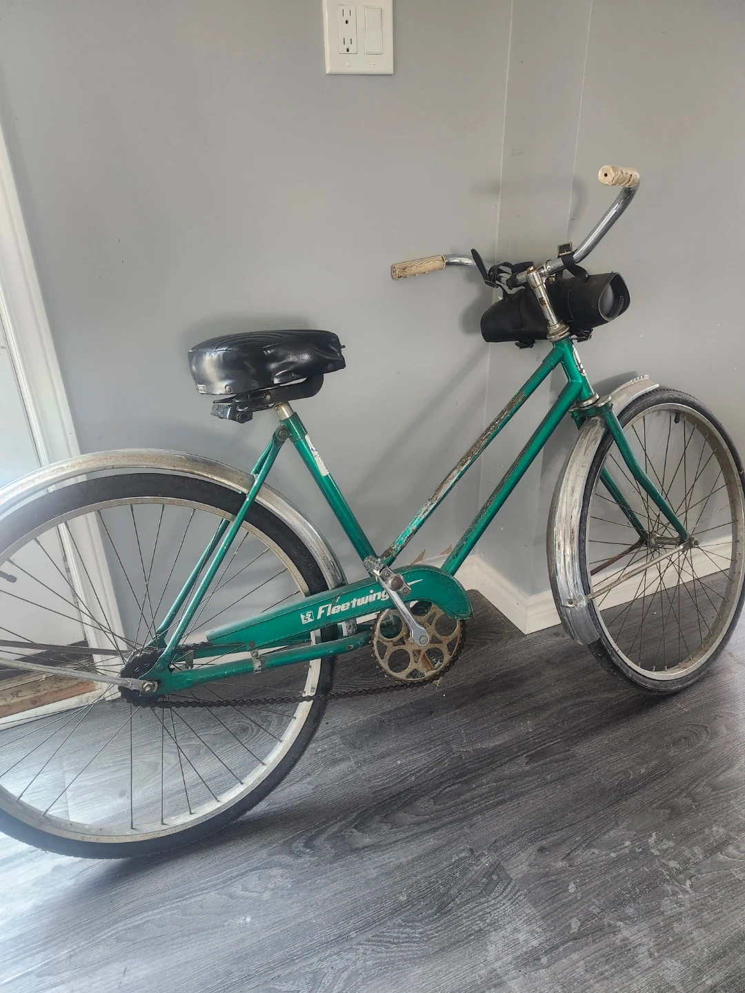 This is a vintage green Fleetwing womens bicycle, manufactured by Simpson's. It's a classic Canadian-made cruiser. Features fenders and a comfortable seat.
