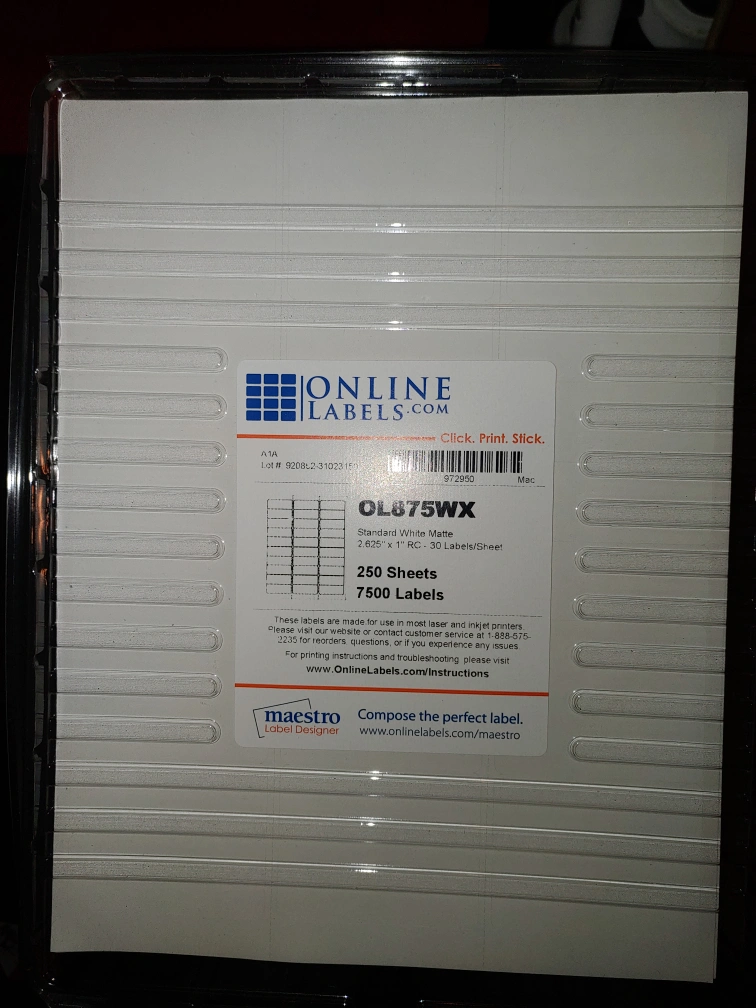 I'm selling 12packs of Online Labels OL875WX standard white matte labels. There are 250 sheets with 30 labels per sheet, totaling 7500 labels. Each label measures 2.625" x 1". These labels are compatible with most laser and inkjet printers. Perfect for all your labeling needs!