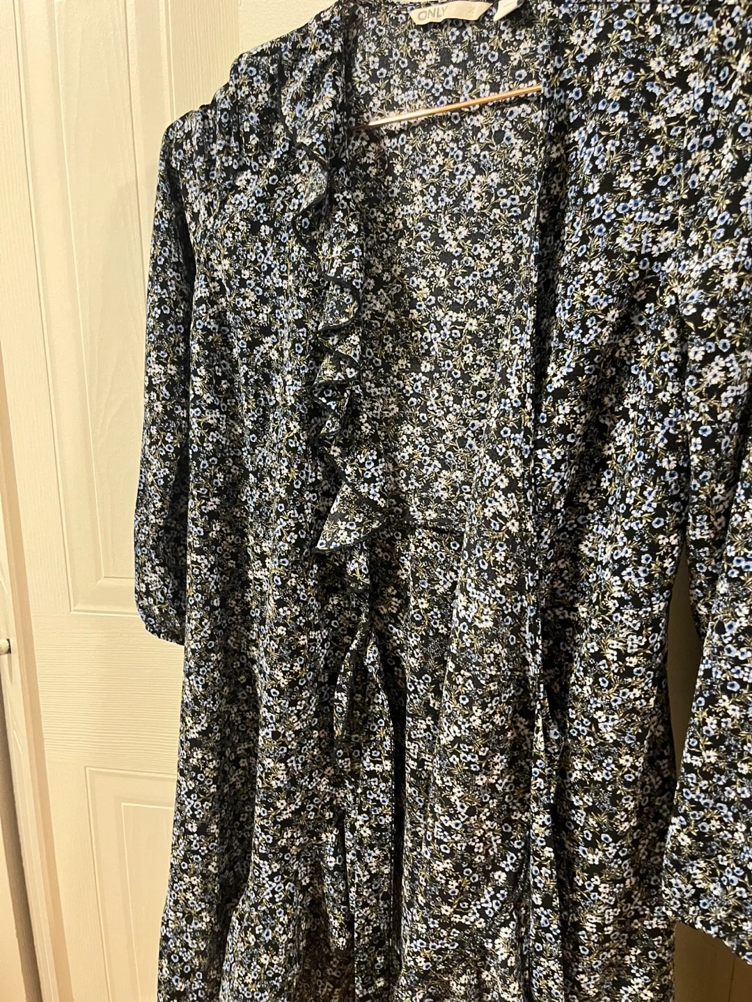 26Cute floral print dress from ONLY! It features a ruffled neckline and a tie at the waist. Perfect for a casual day out or a summer evening. Worn only once