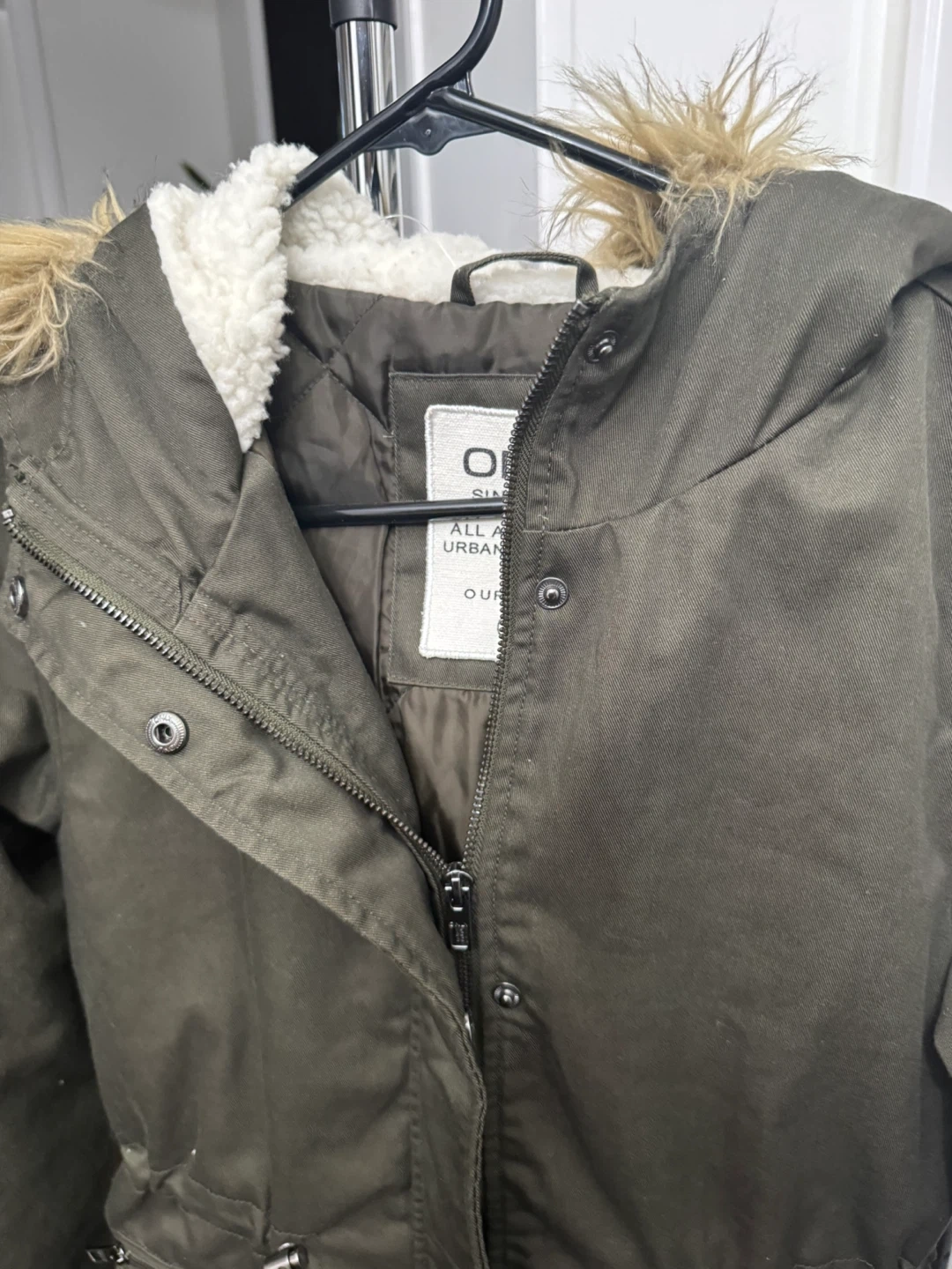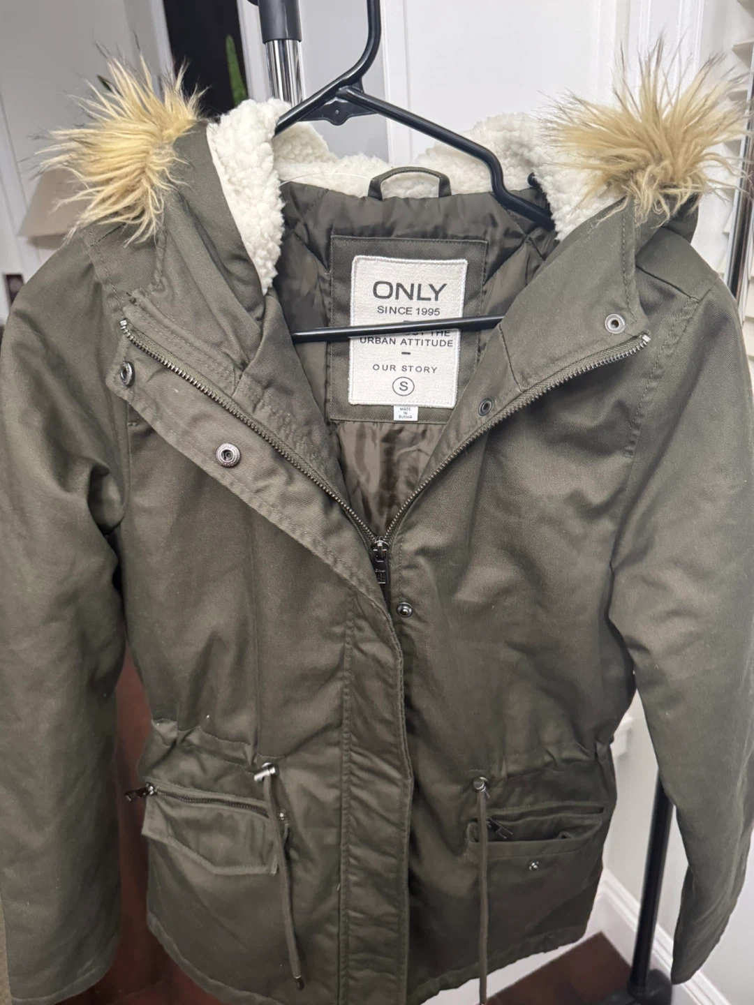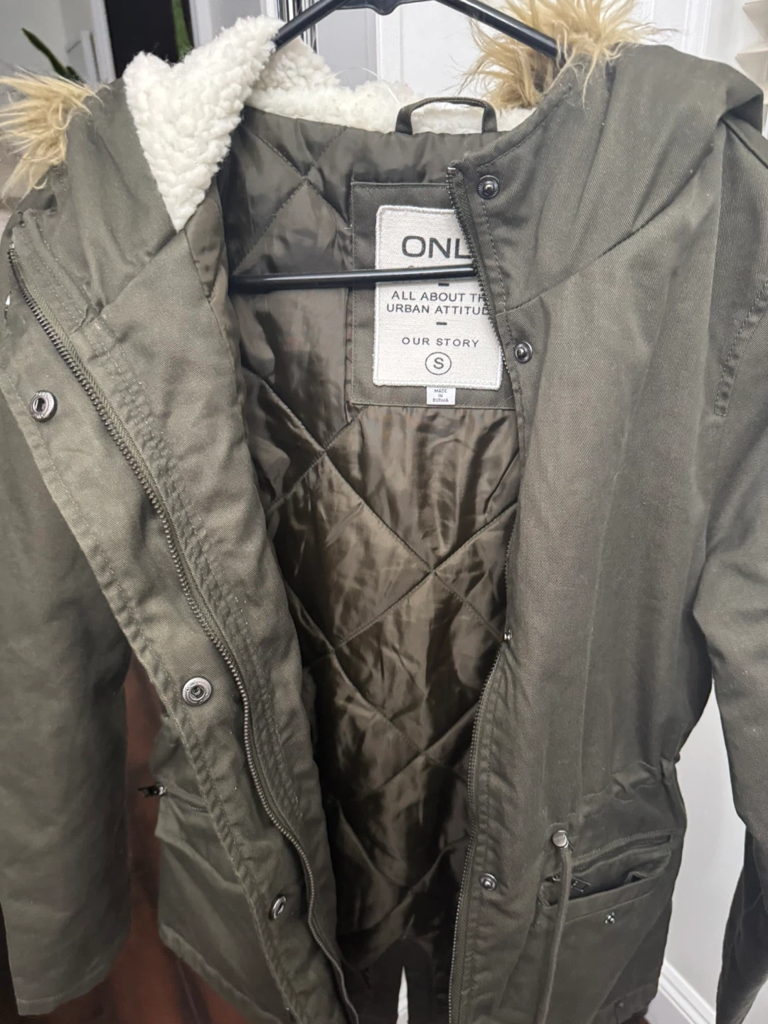 93Cozy olive green winter parka from ONLY! It’s a size small and features a faux fur trim on the hood. Perfect for staying warm and stylish during the colder months!
