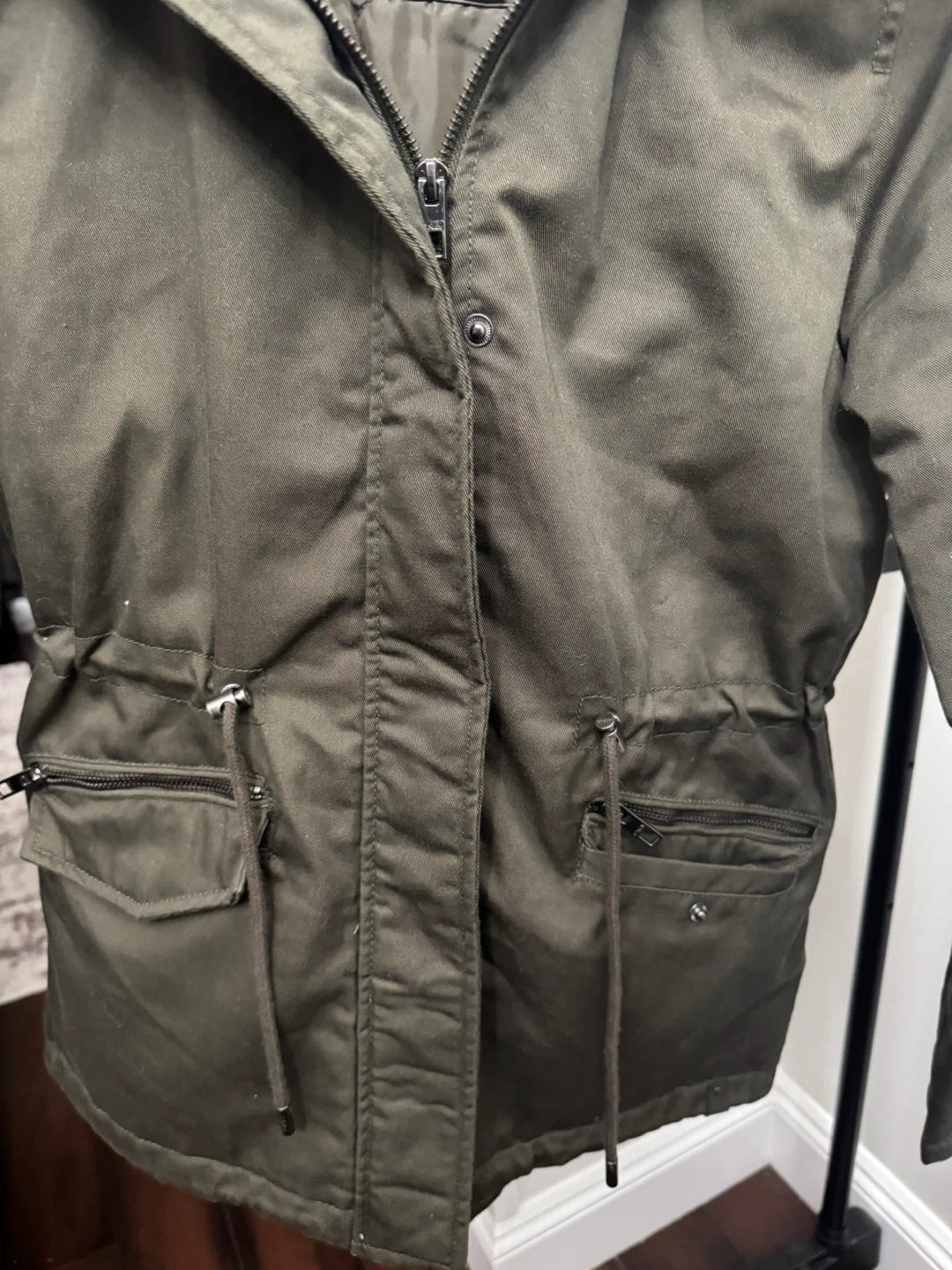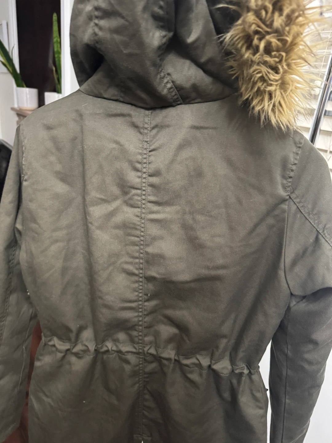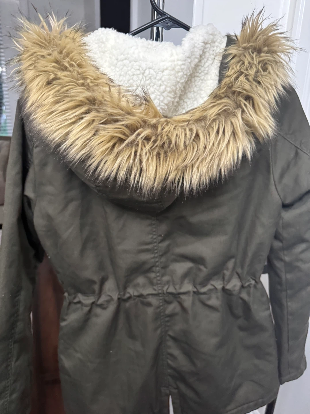93Cozy olive green winter parka from ONLY! It’s a size small and features a faux fur trim on the hood. Perfect for staying warm and stylish during the colder months!
