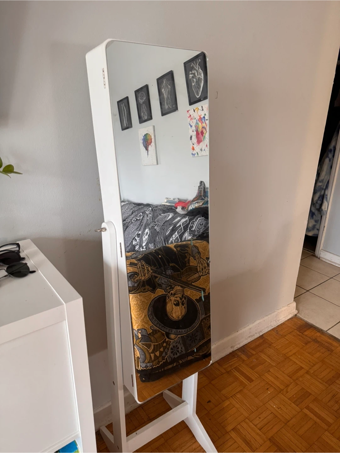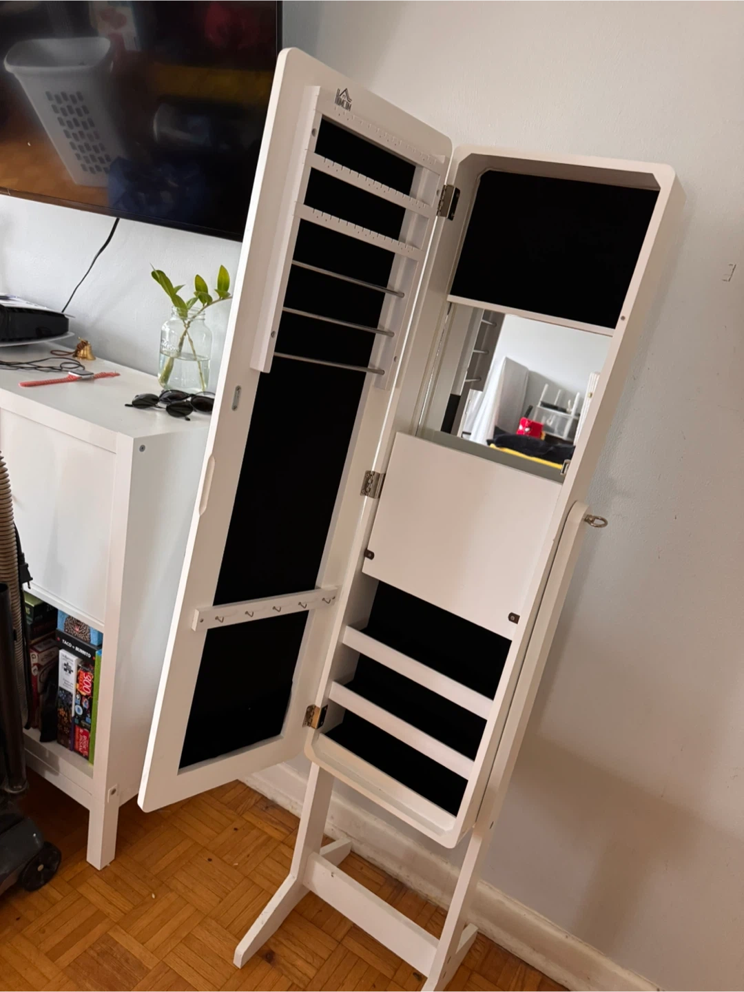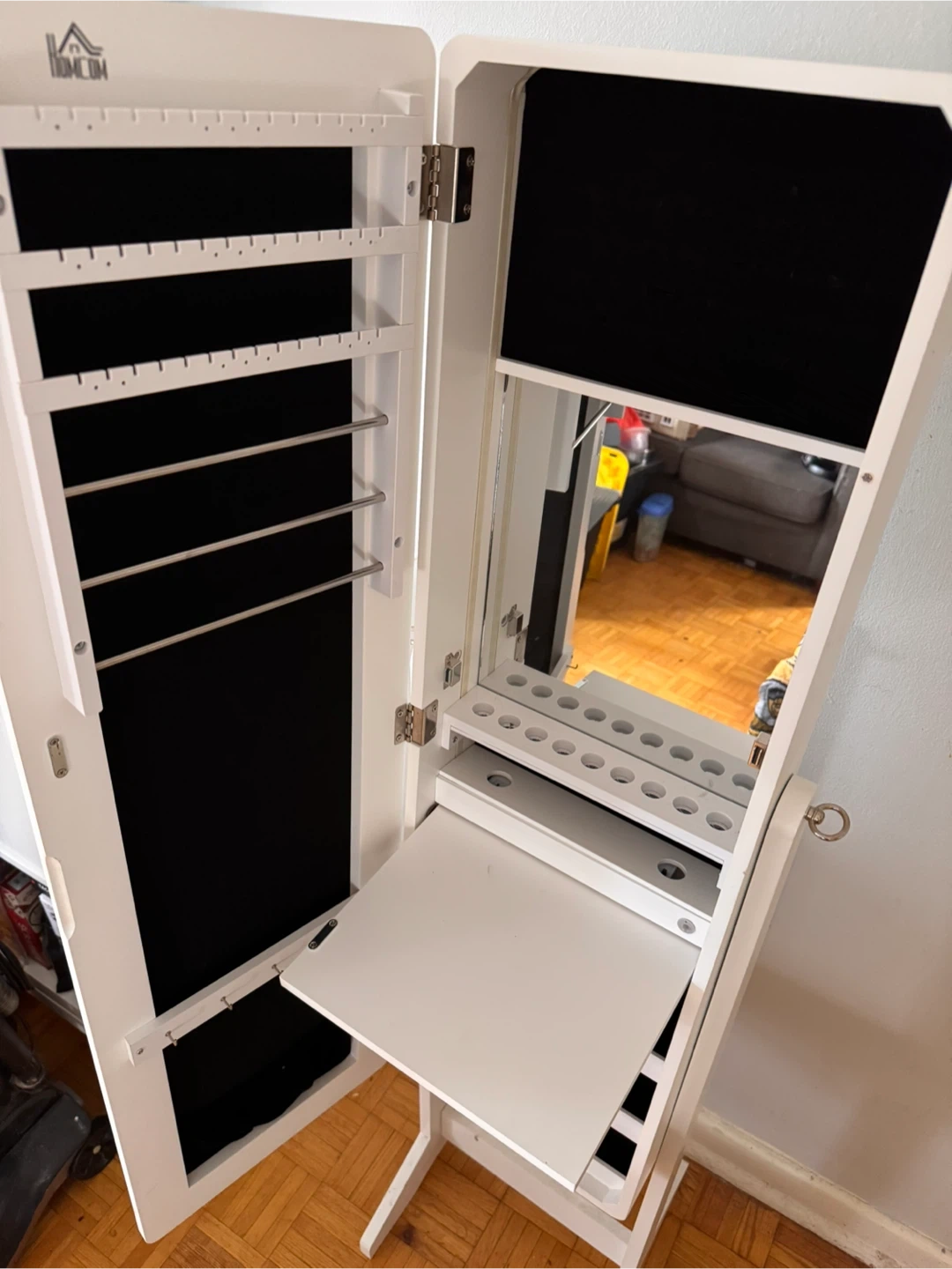 This Homecom jewelry armoire offers a full-length mirror and interior storage. It features multiple compartments and hooks for organizing your jewelry. It's perfect for keeping your accessories neat and accessible.
