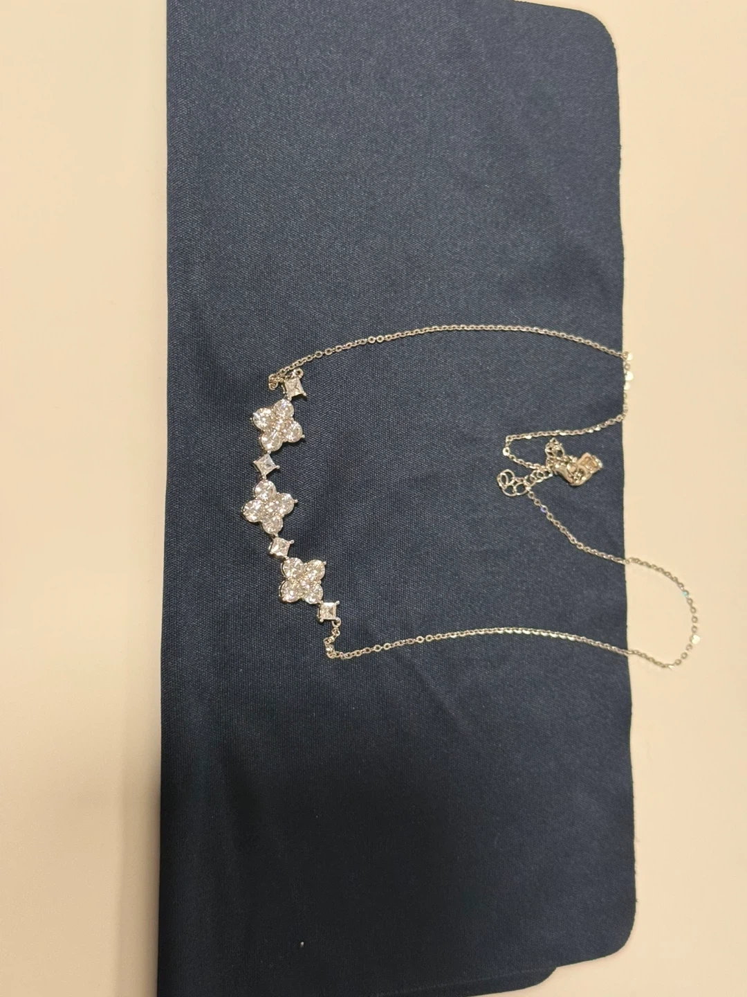A delicate silver-tone necklace featuring a chain with several clover-shaped charms accented with sparkling stones. It has an adjustable clasp for a comfortable fit. Perfect for adding a touch of elegance to any outfit!