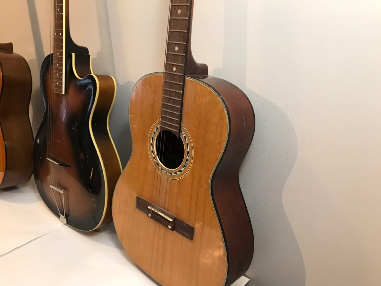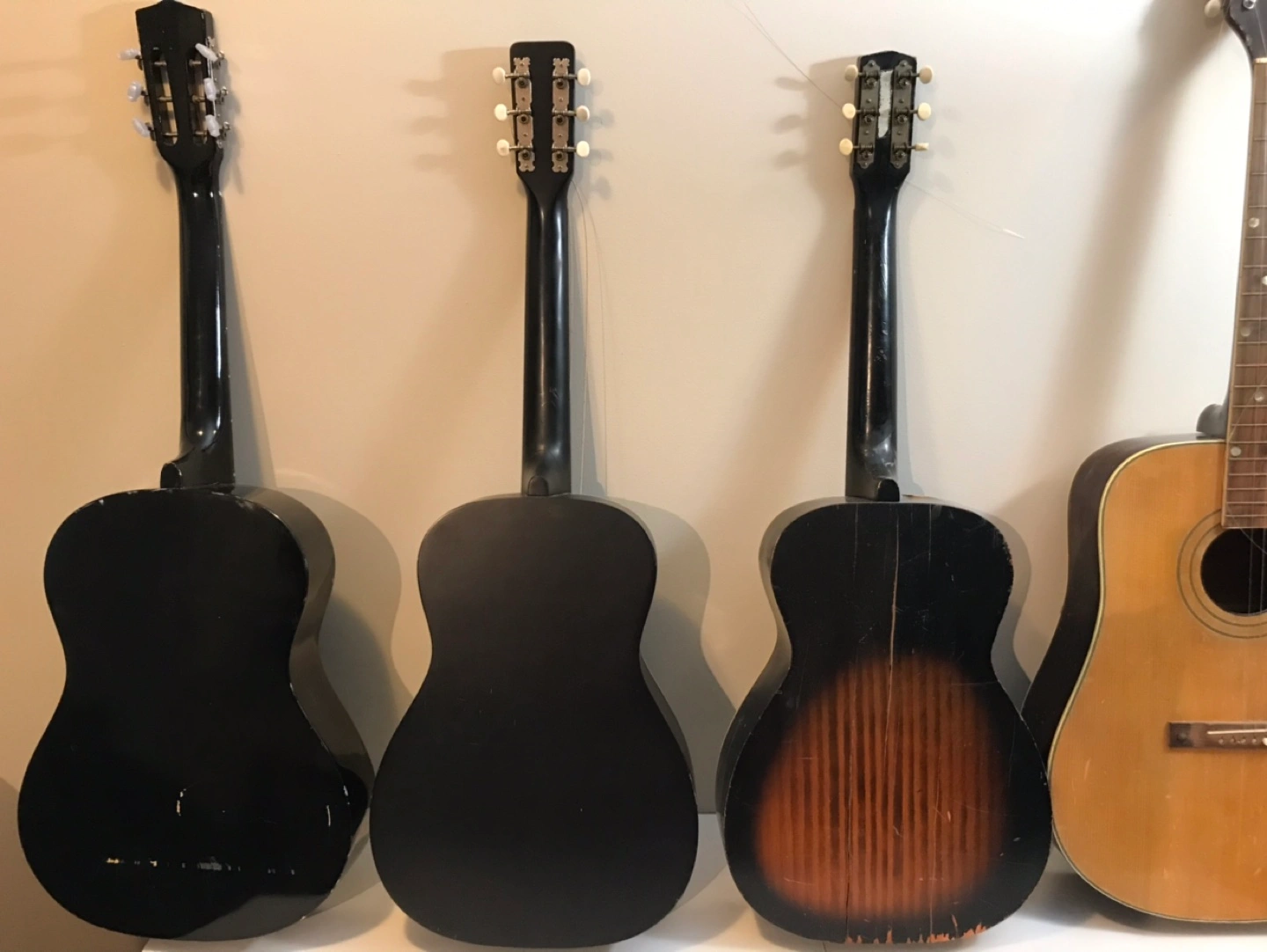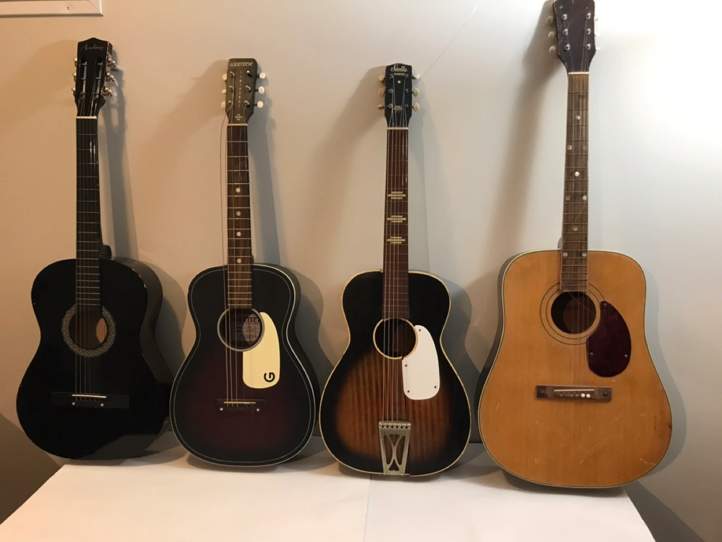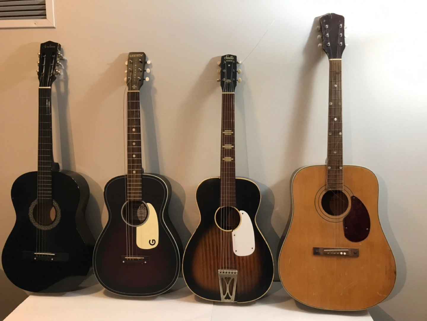 Set of 7 vintage and retro acoustic guitars. Some wear and tear is present on the guitars, some have damage would need repair . Some are in playable condition. Would make great decor in a home or music room. 5 guitar cases included .