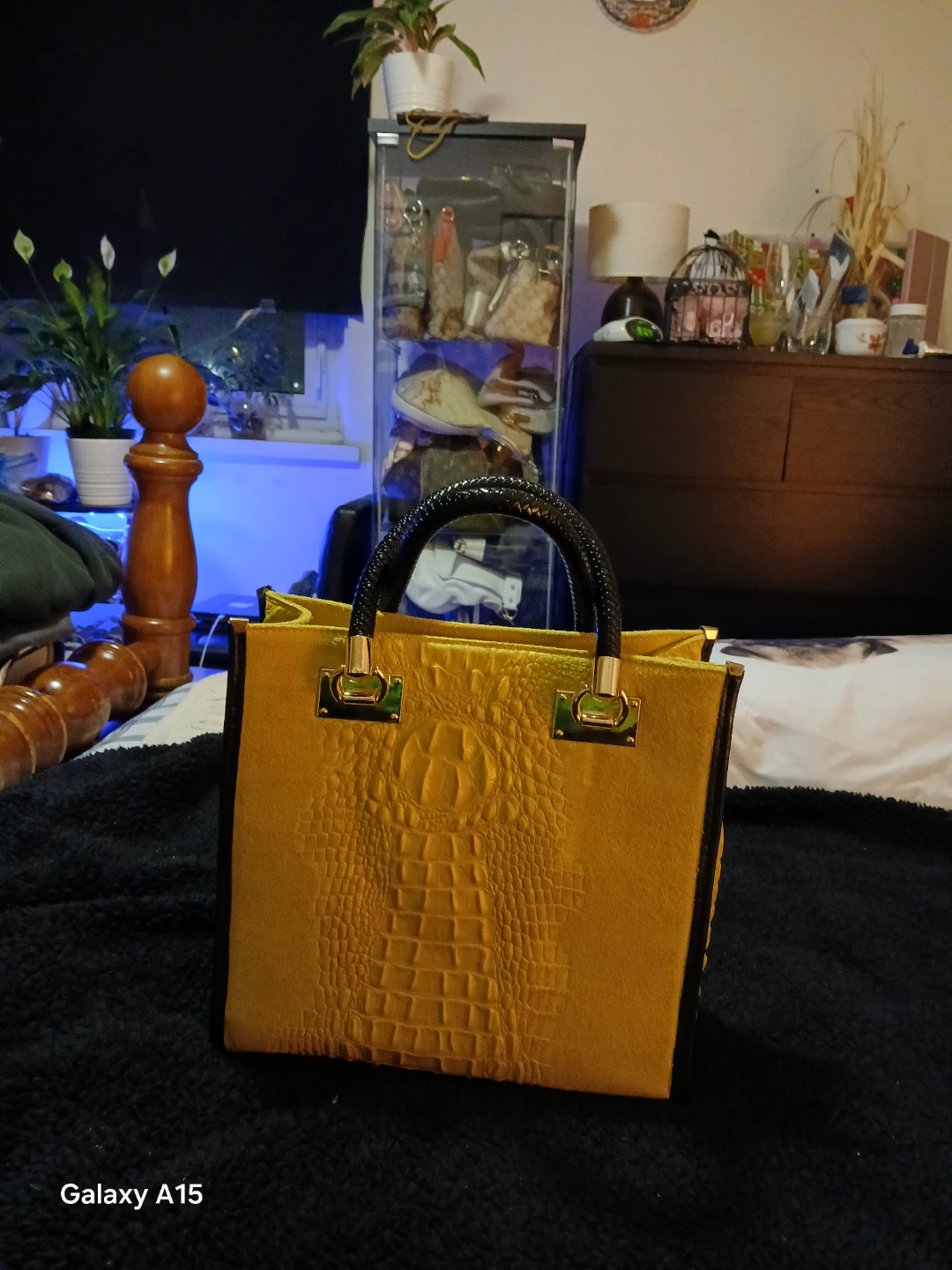 This Light Green tote bag features a croc embossed leather front. It's made in Italy and has a suede interior. The bag includes black faux leather handles with gold hardware.