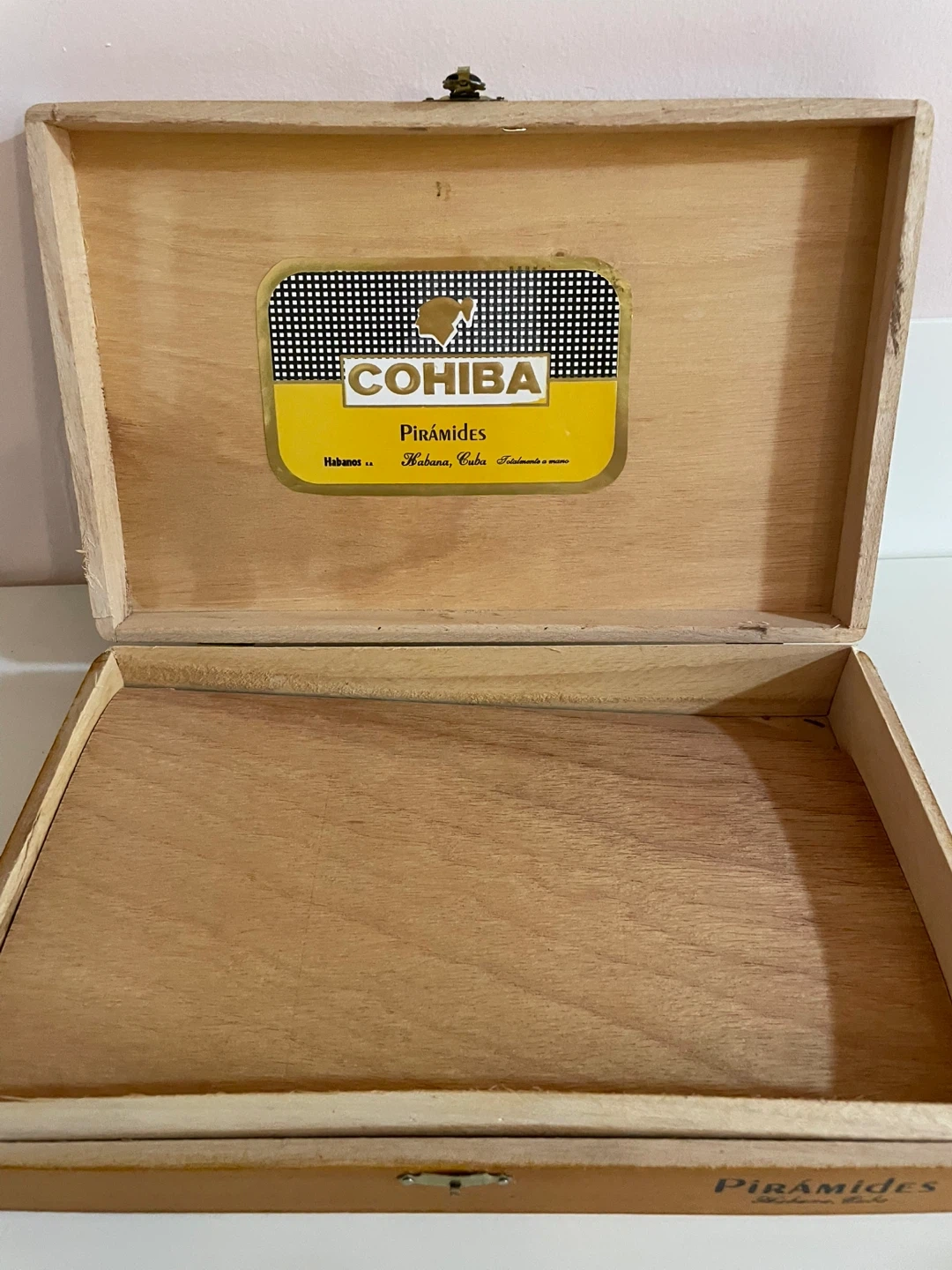 This is a Cohiba Piramides wooden cigar box. It's made of wood and comes with its original label. This box is great for storing cigars or other small items.
