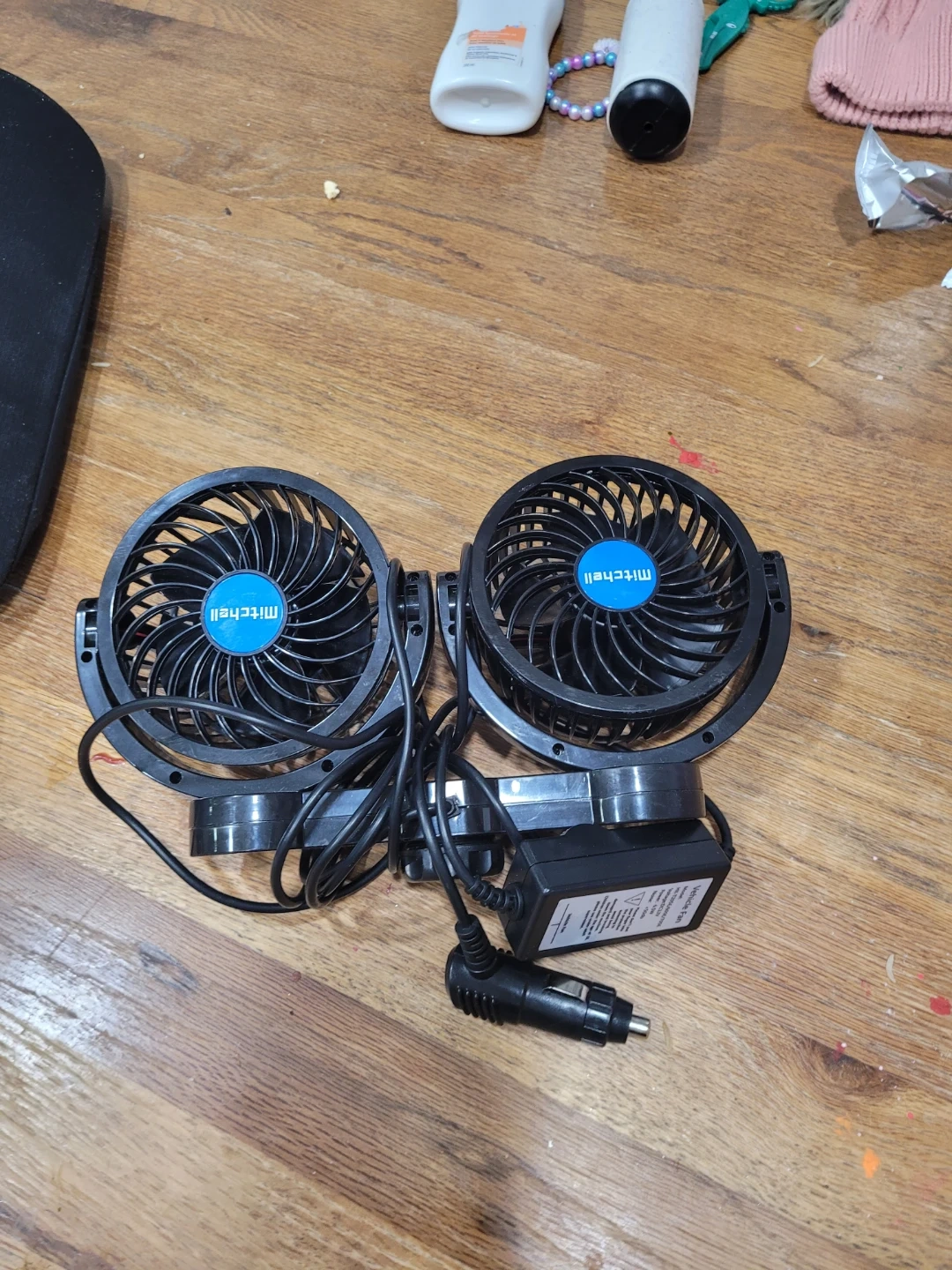 Double Mitchell brand car fans, black colour. These plug into your car's 12V outlet. They're great for keeping the air circulating on a hot day!