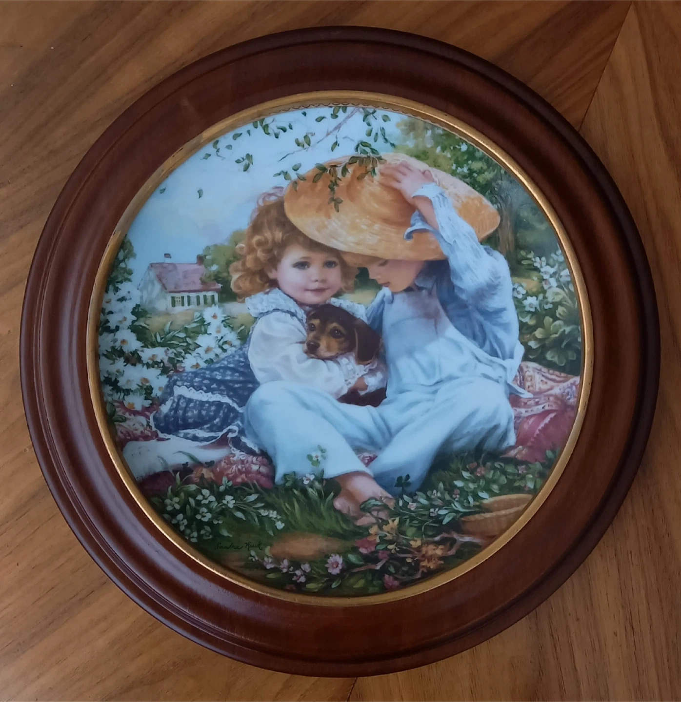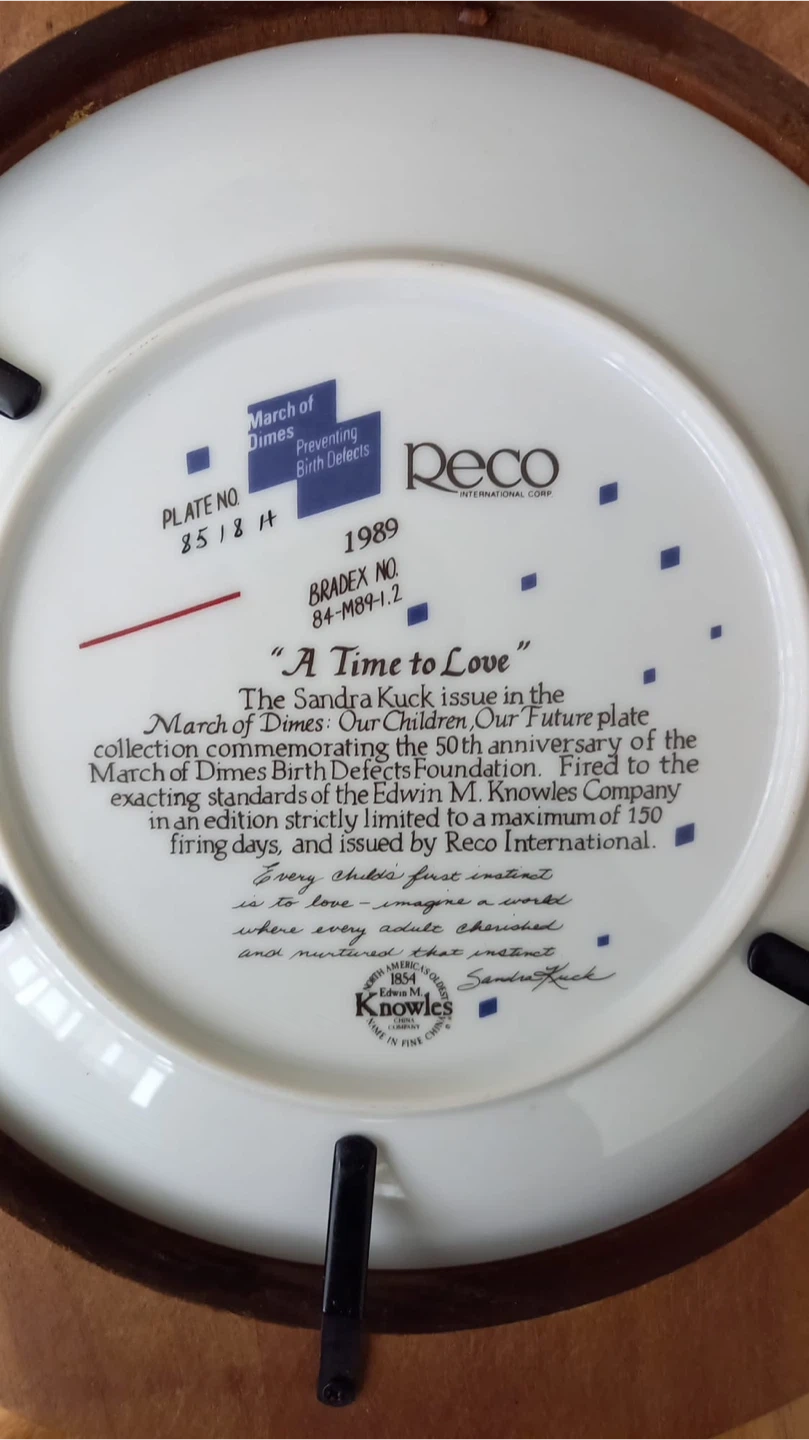 This is the "A Time to Love" collector plate from the March of Dimes Our Children, Our Future plate collection. It was issued in 1989. The plate features a charming illustration of two children and a puppy in a garden setting, enclosed in a decorative wooden frame. It's a limited edition piece, strictly limited to a maximum of 150 firing days. This plate is perfect for collectors of Sandra Kuck's artwork or commemorative plates.
