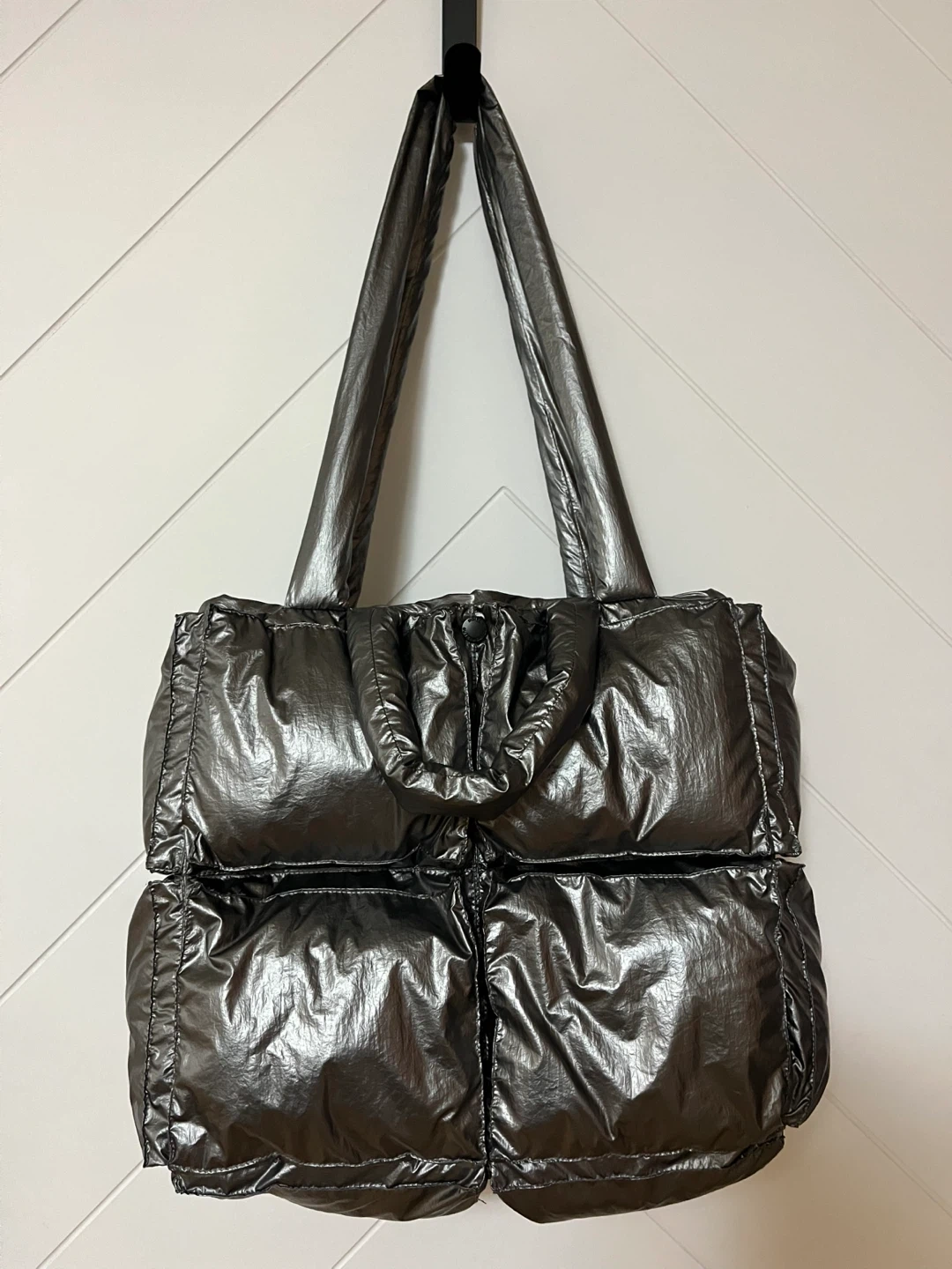 Puffer tote bag with a metallic silver finish