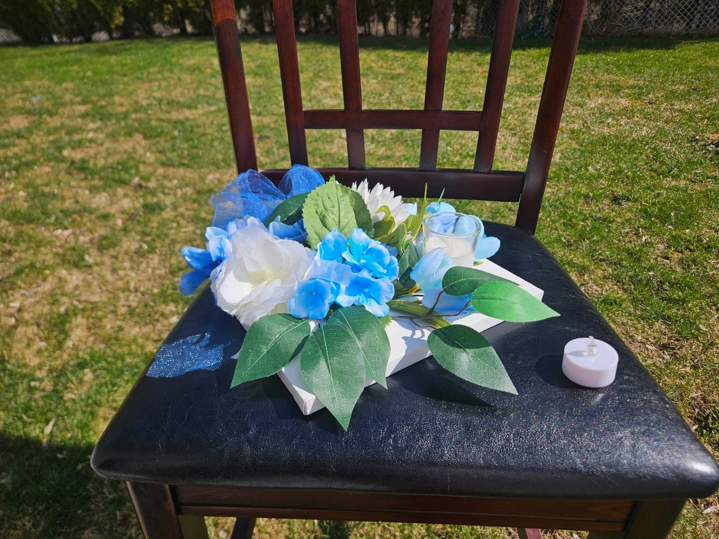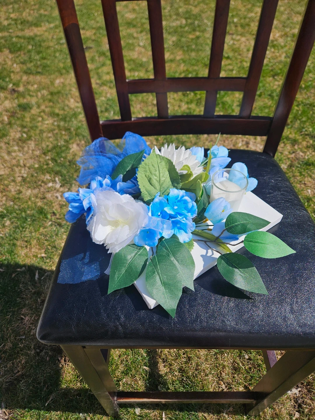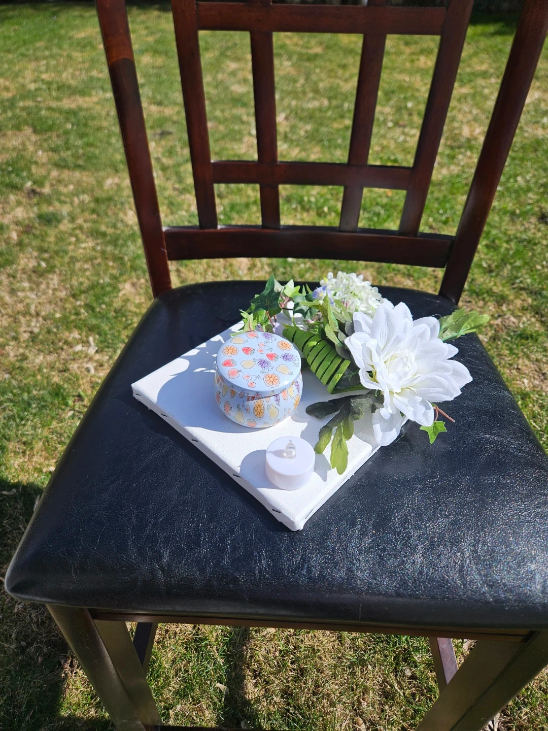 This set includes a small decorative candle in a tin with a lid, accented with artificial flowers and greenery. It's a lovely piece for adding a touch of charm to any space. The candle itself is scented and sprinkled with decorative elements.