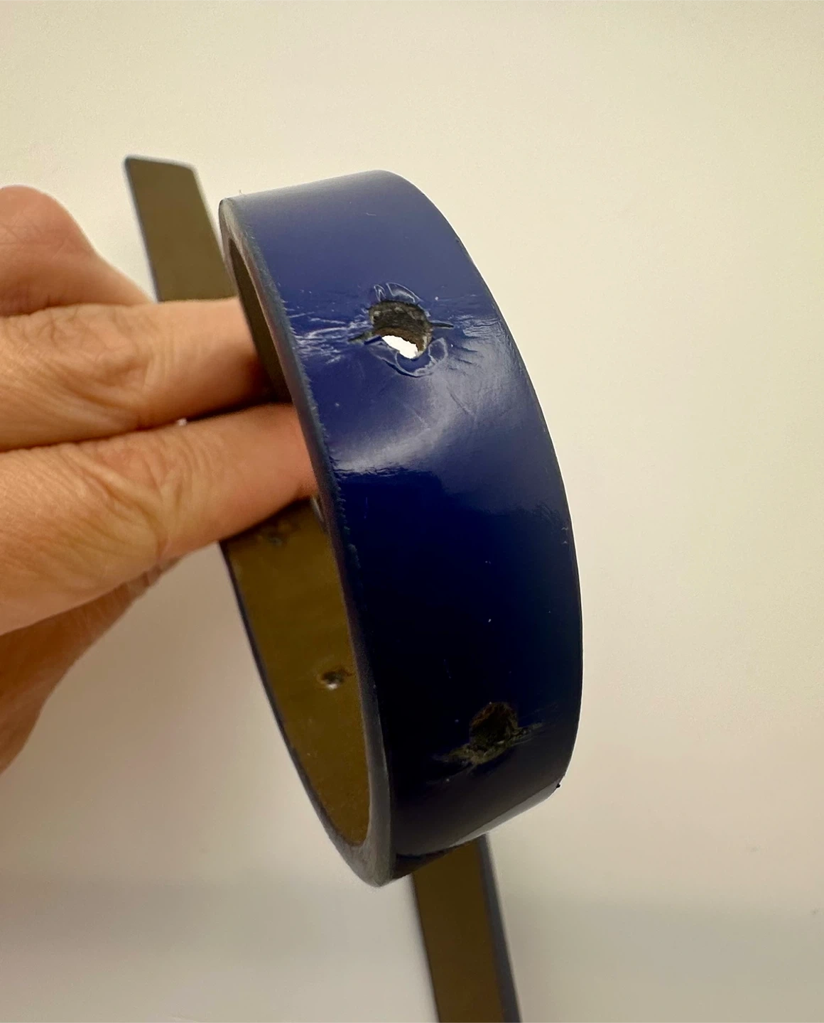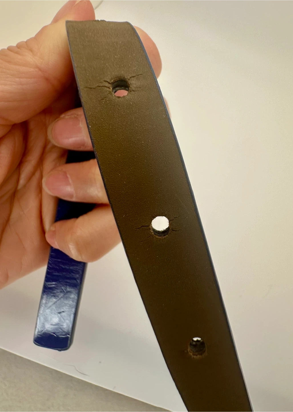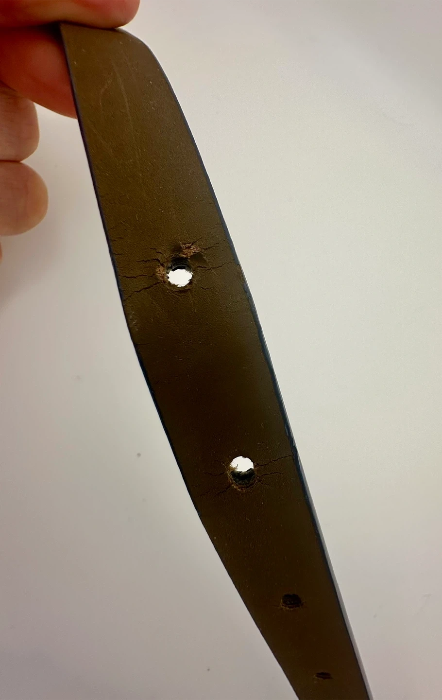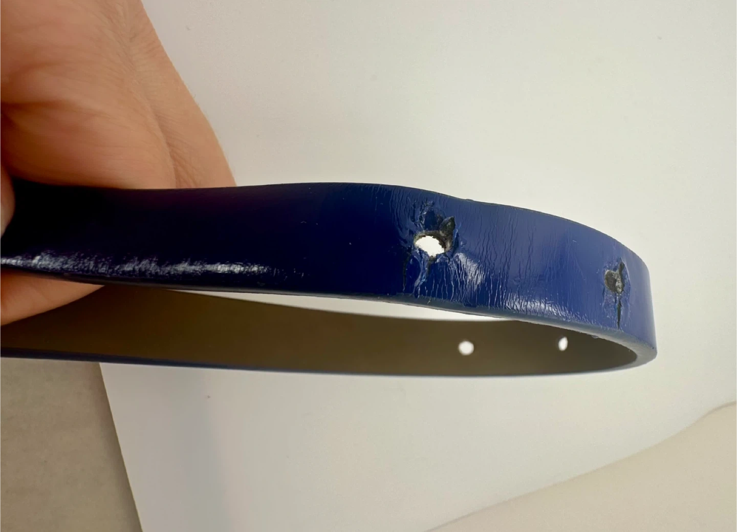 Condition: Pre-owned and clean. Some visible cracking around the holes, especially the last two. Minor wear/rubbing on the belt loop.
