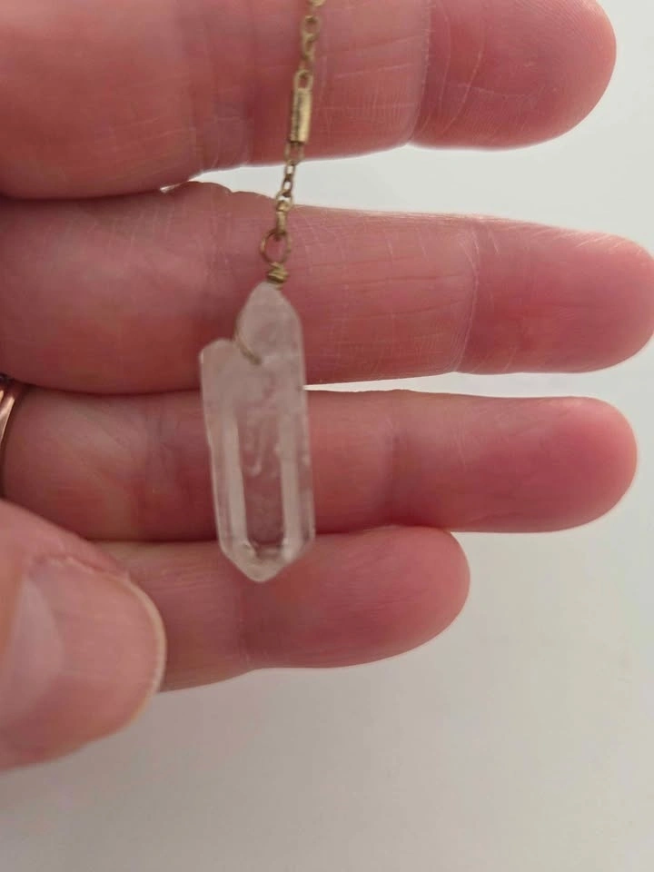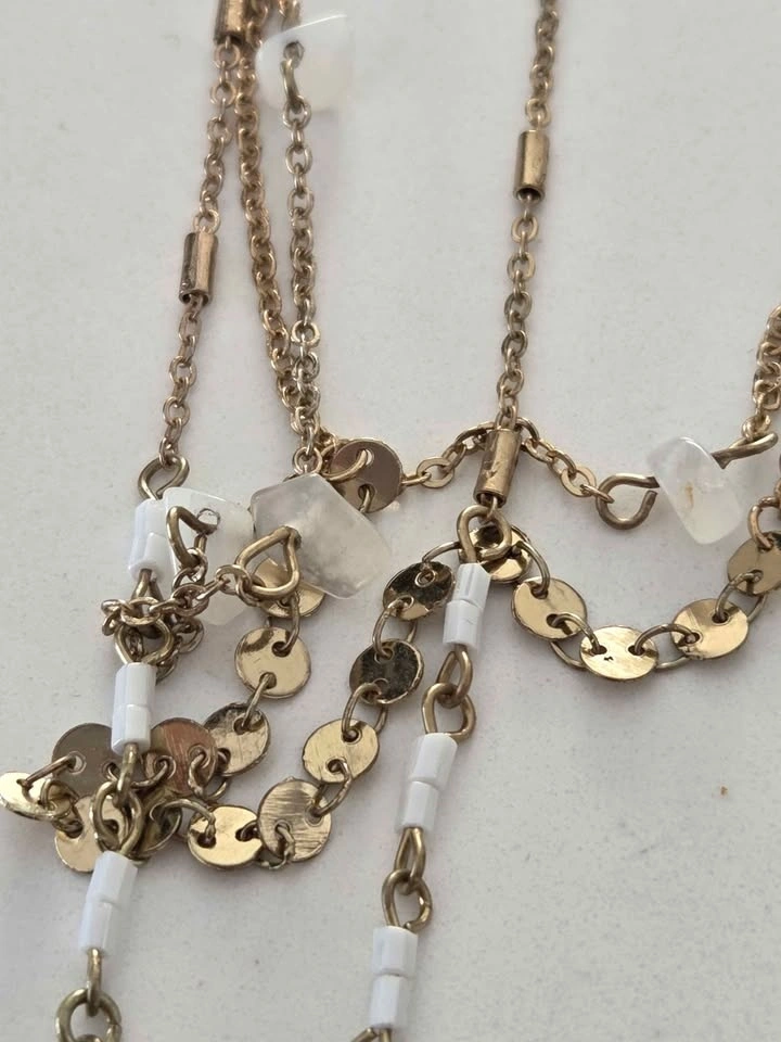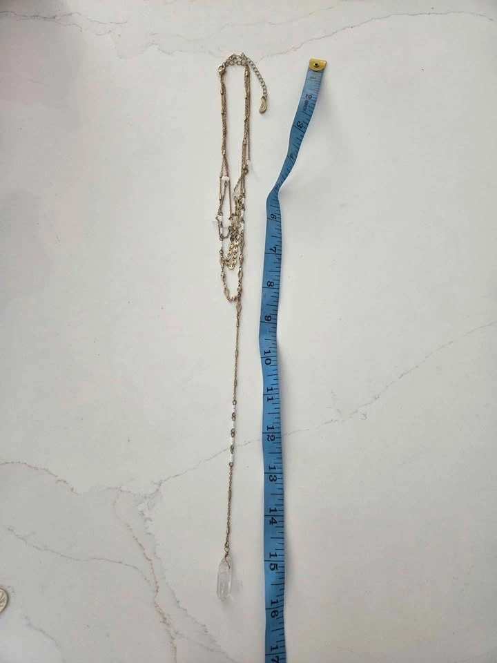 Free People layered gold-tone necklace with a quartz crystal drop. Lightweight, boho-inspired, and easy to style with dresses or casual outfits. Multi-strand design with a lariat finish and crystal accent. Good condition, there is a flaw in the top of the quartz piece, which may be natural. See pics for condition and measurements. Pick up in Oshawa near Rossland and Wilson.