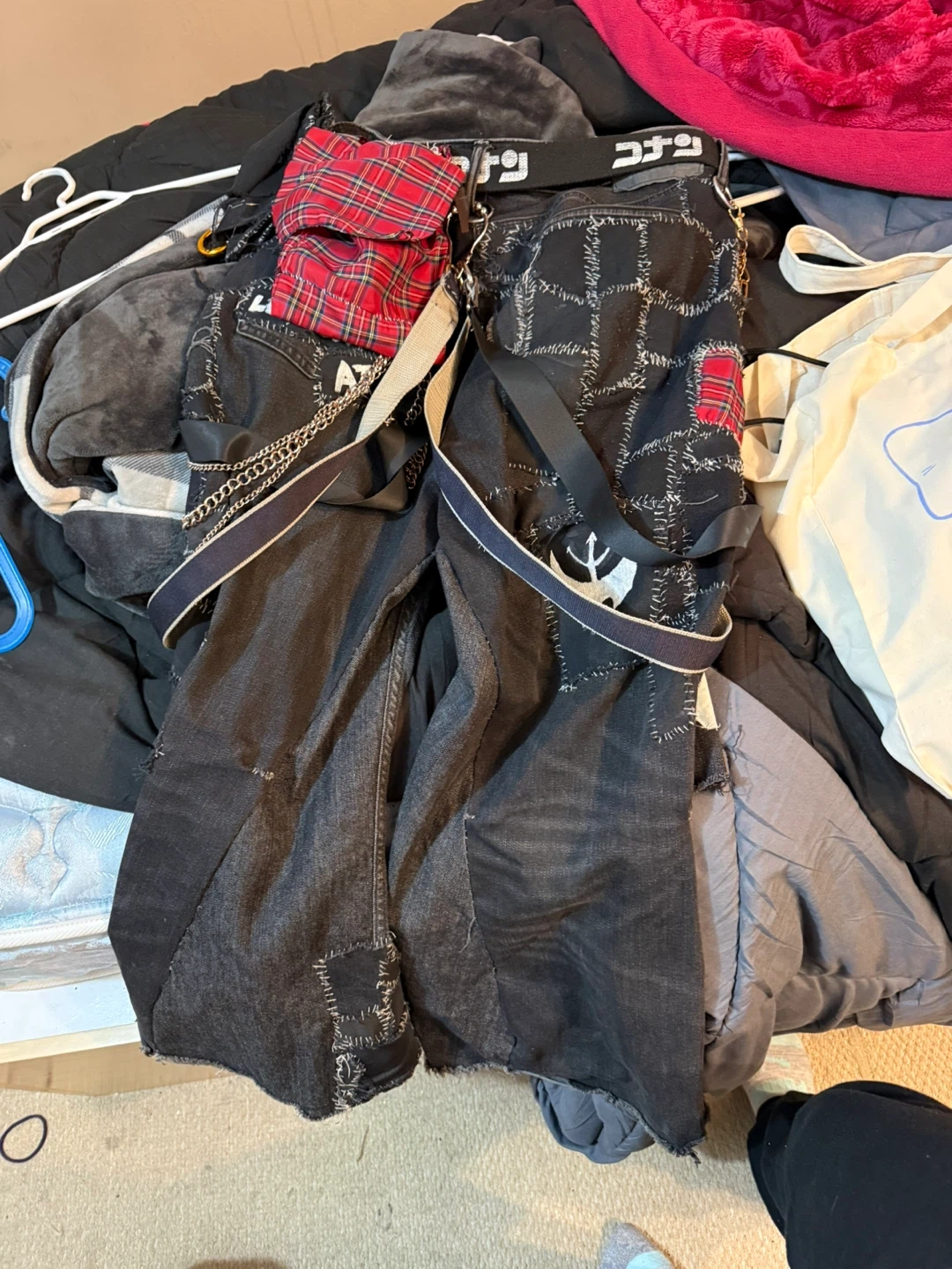 Selling these unique, custom-made patchwork pants! They feature a variety of patches, chains, and straps, giving them a distinct look. Perfect for someone who loves alternative fashion and wants to stand out from the crowd