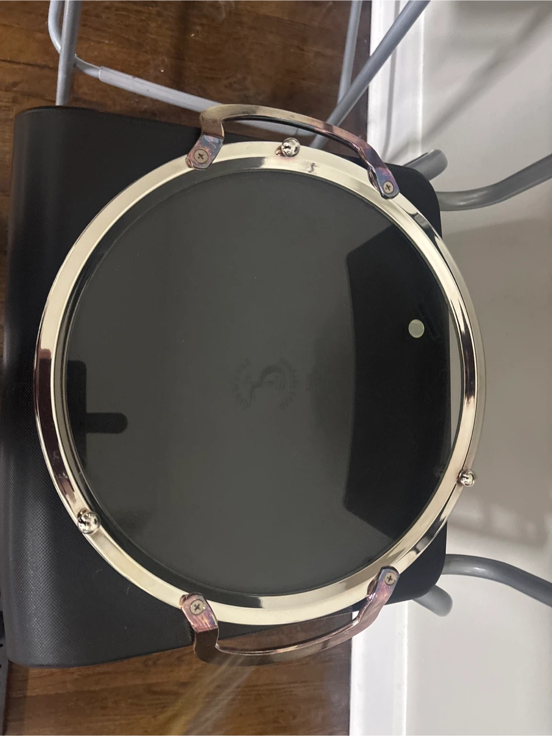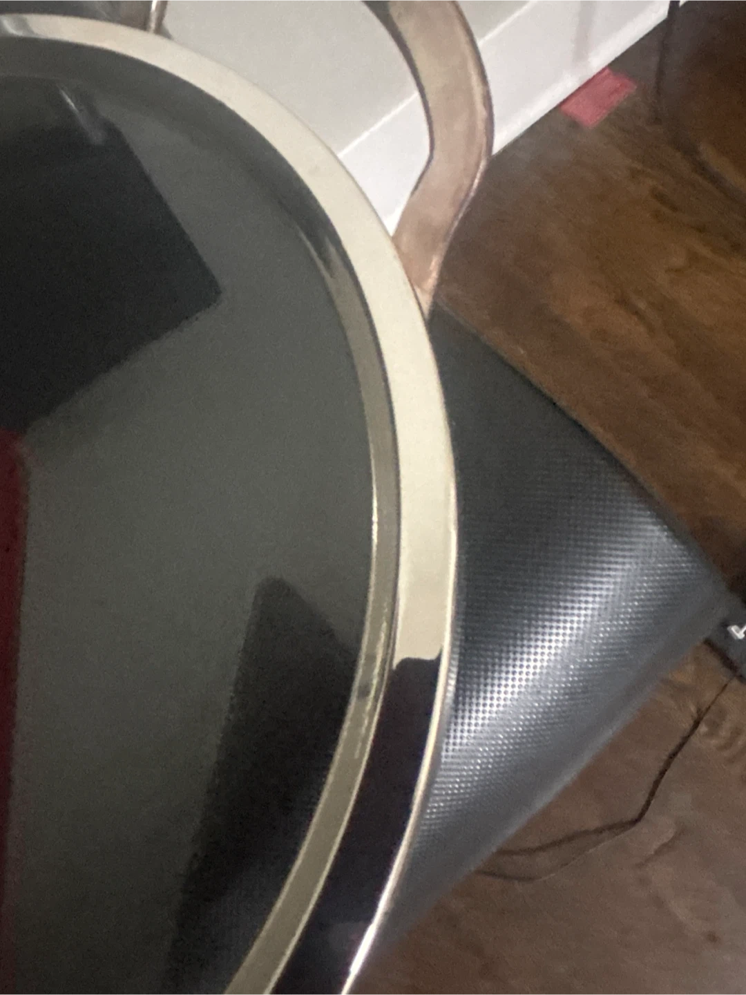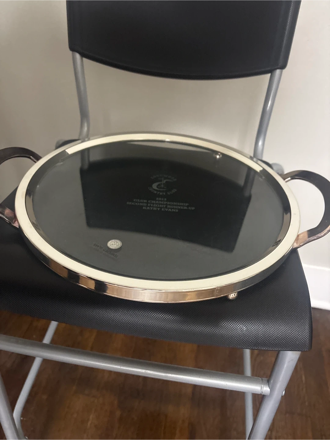 This is a round serving tray with silver-tone handles and a glass insert. Its polished rim adds a touch of elegance. Perfect for serving appetizers or displaying items.