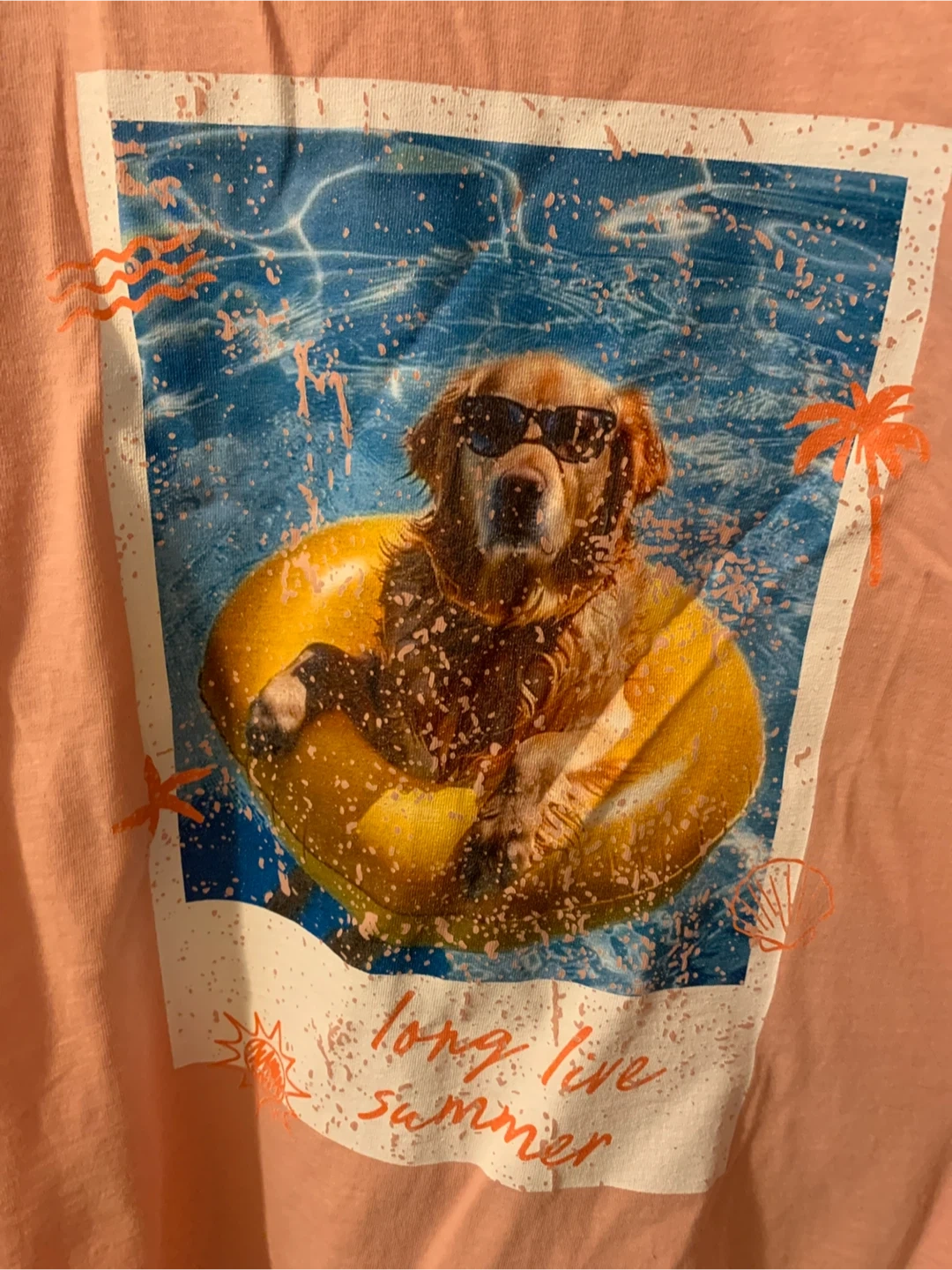 BN and never worn or washed, adorable summer t-shirt in an XL. It is from a company in Nashville called Pink Lily and I ended up with two, so selling one. It's a light peach colour with a fun graphic of a Golden Retriever on a floatie. The shirt is made of thick 100% cotton and is in perfect condition! It fits oversized so can be used as a cover up for the beach or a lounging tee with shorts or leggings! Dog lovers will love this!