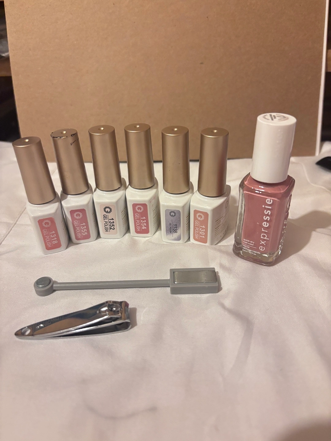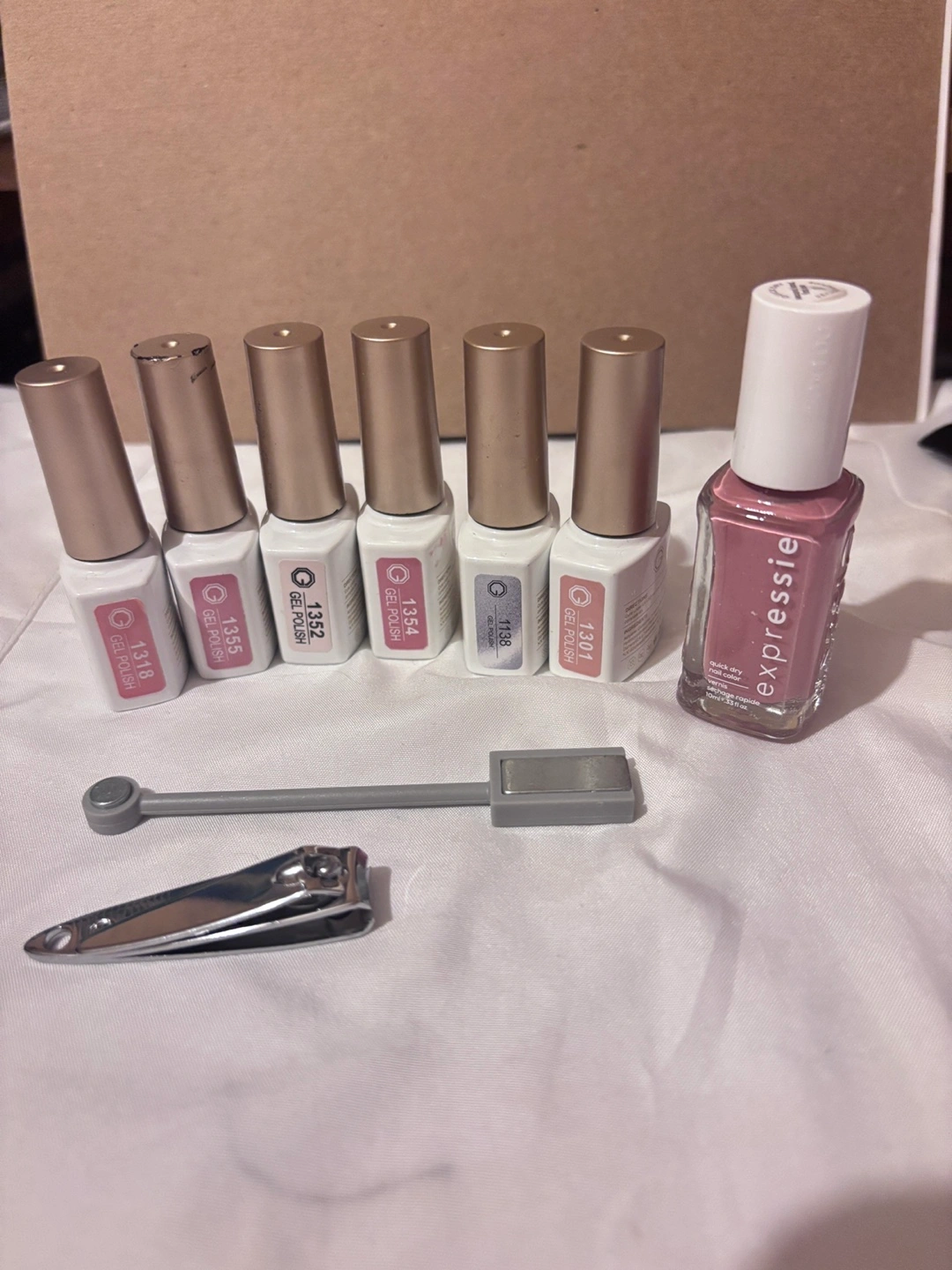 Six GAOY soak-off gel polishes in various colours. Includes one Expresssie nail polish and manicure tools. Great for at-home manicures.