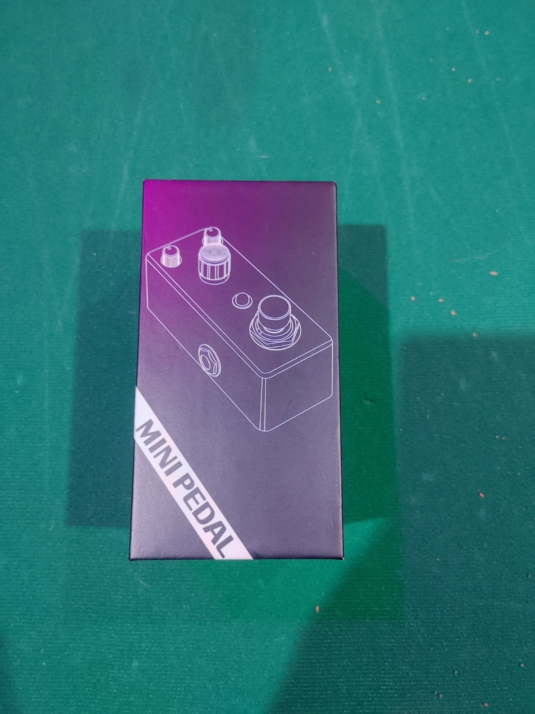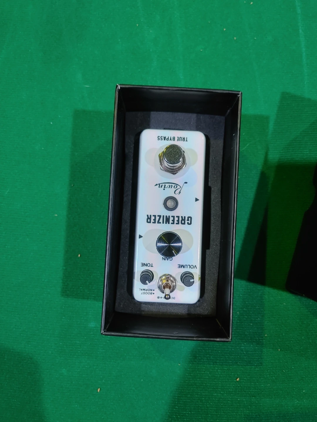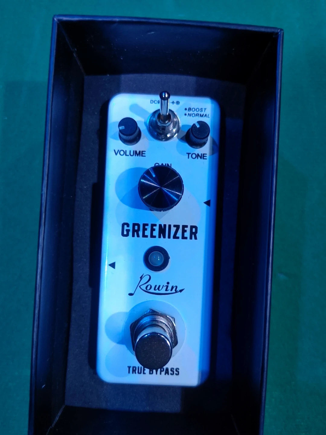 This Rowin Greenizer mini pedal offers true bypass functionality for your guitar setup. It features controls for Volume, Tone, and Gain, with a toggle for Boost or Normal mode. Includes original box and packaging.