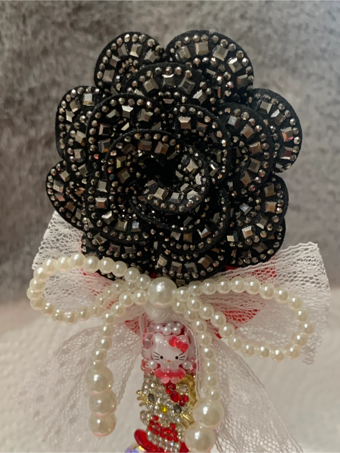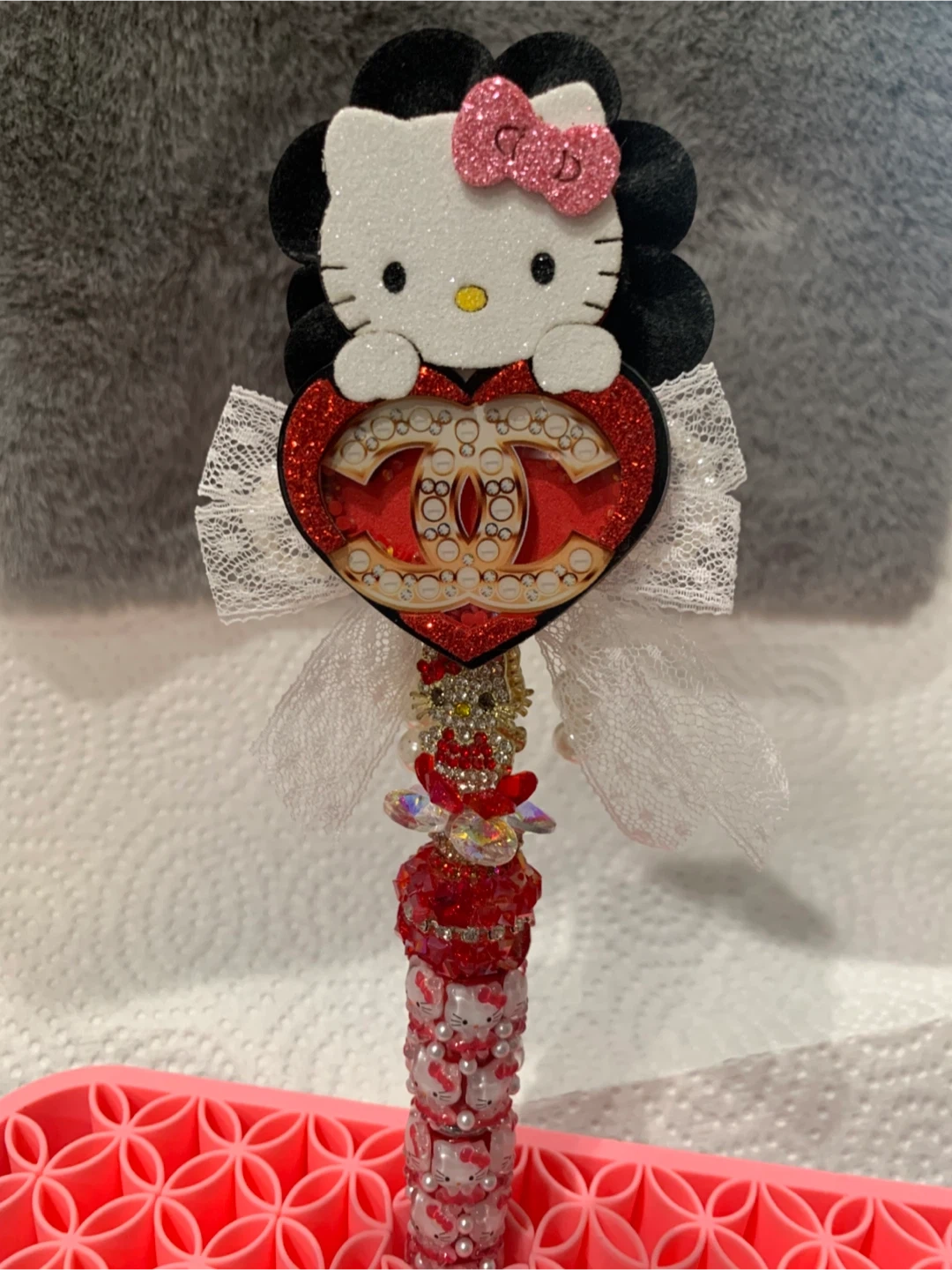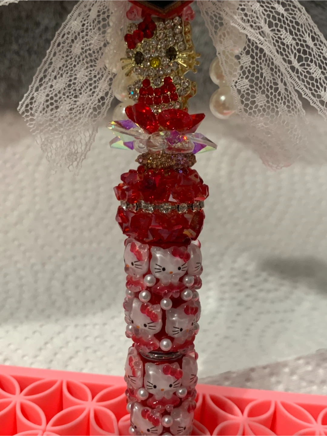 This sparkly fancy pen wand features a Hello Kitty head with a pink bow, holding a red heart charm adorned with rhinestones. The pen is decorated with multiple Hello Kitty faces and pearls. It's covered in red and clear rhinestones and has delicate white lace accents. It's a fancy pen for school or work !!