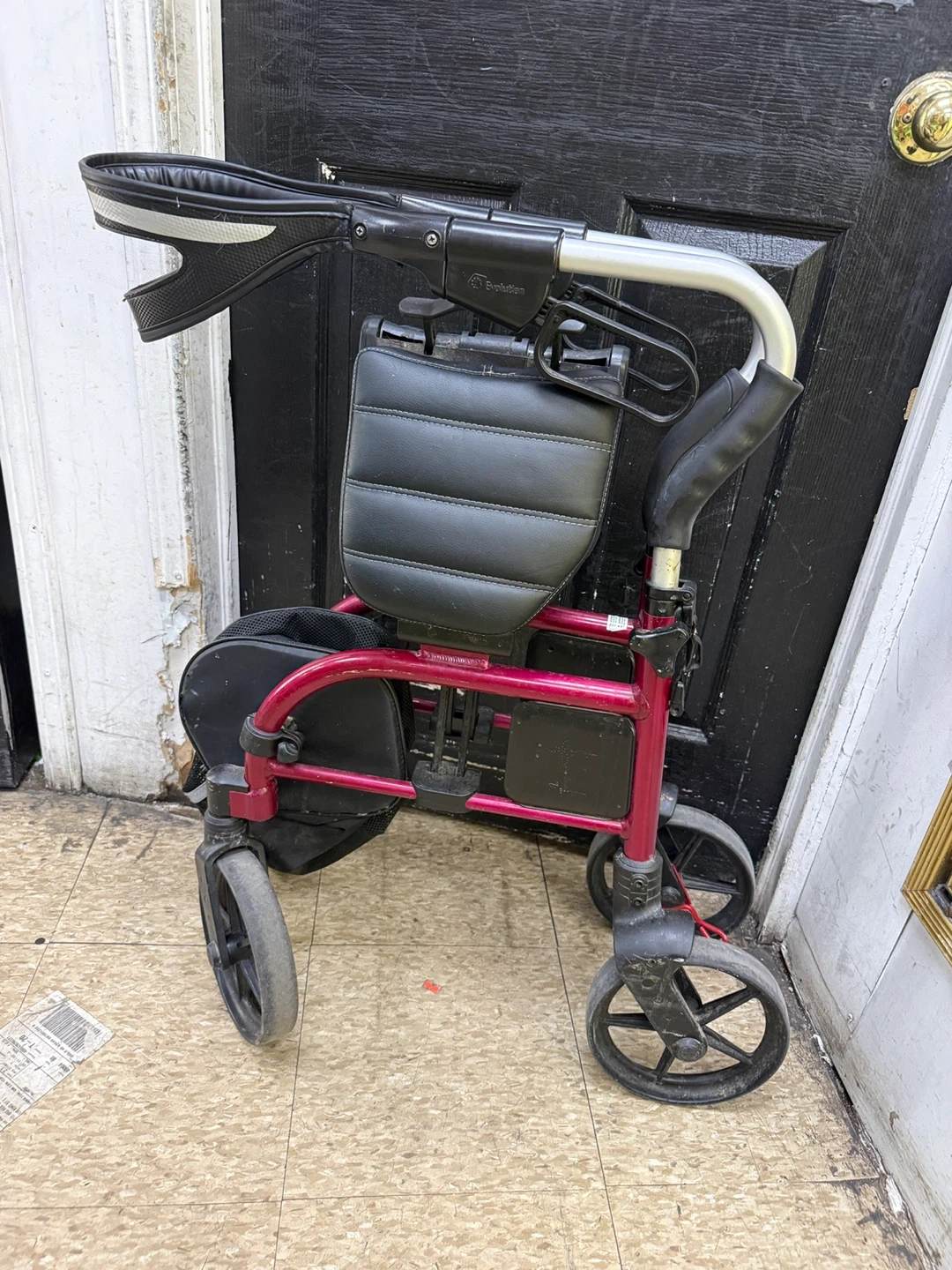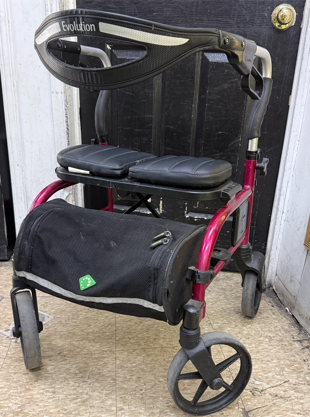 This is an Evolution brand walker in a berry red colour. It features a padded seat and a large mesh bag for storage. The walker's height is adjustable. It's easy to fold for transport.
