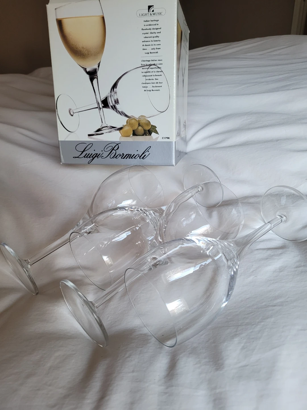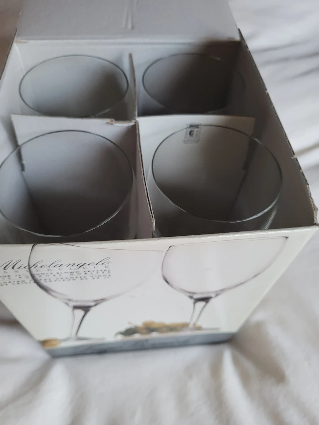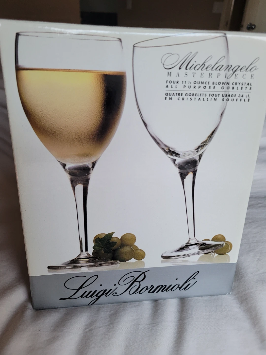 Perfect condition- like new! Four Luigi Bormioli Michelangelo wine glasses. These are 11-ounce capacity, made from crystal and designed for all-purpose use. They offer clarity and inherent quality. Great for serving any beverage!