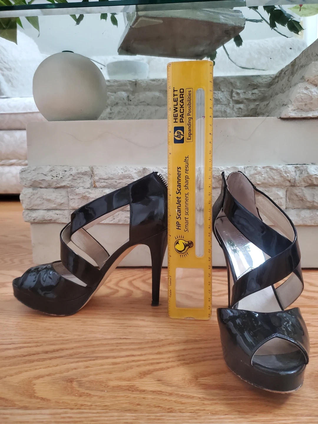 Size 7.5 Black patent leather heels from Michael Kors. Peep-toe style with criss-cross straps and a stiletto heel height of 4". Includes a platform for added comfort.