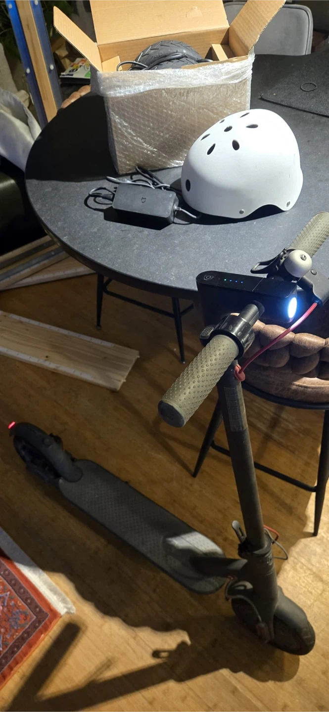 Xiaomi Mi electric scooter in black. It's in good working condition with a charger included. Battery indicator lights are green. This scooter's foldable design makes it easy to store and transport.