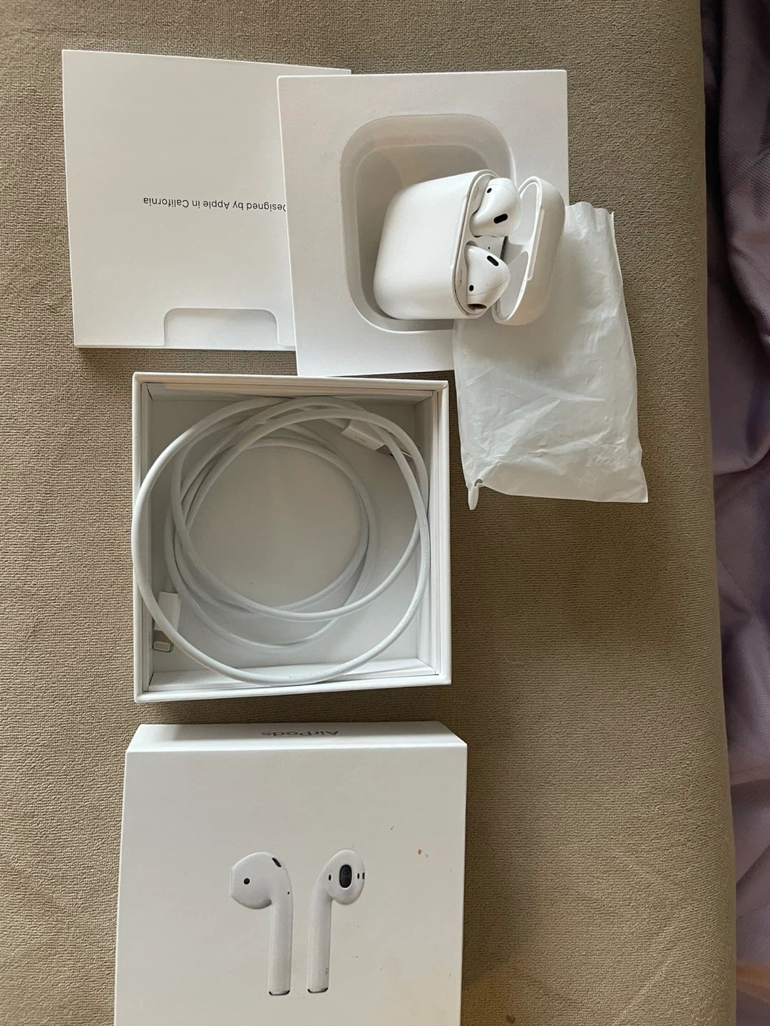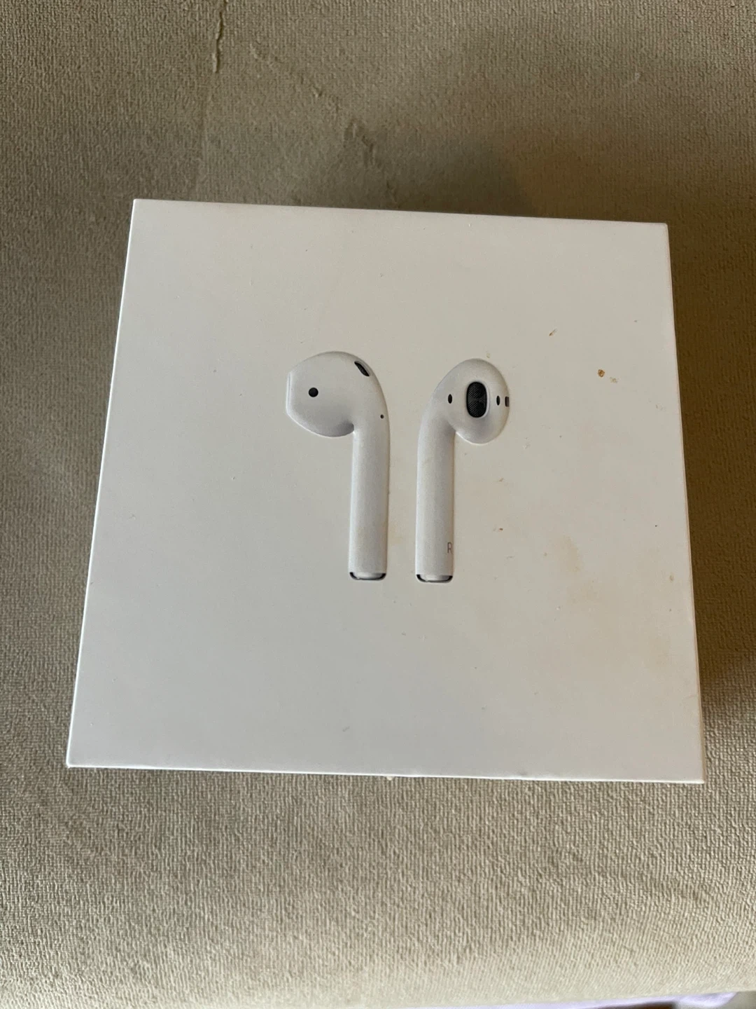 Apple AirPods with a charging case. Comes with original box, charging cable, and documentation. These are in-ear wireless earbuds.